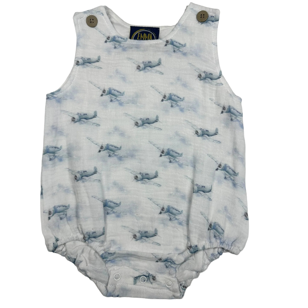 This is the perfect summer outfit for the future pilot of the family! It is a muslin bubble with a whimsical airplane themed print. Coordinate with matching sibling outfits.