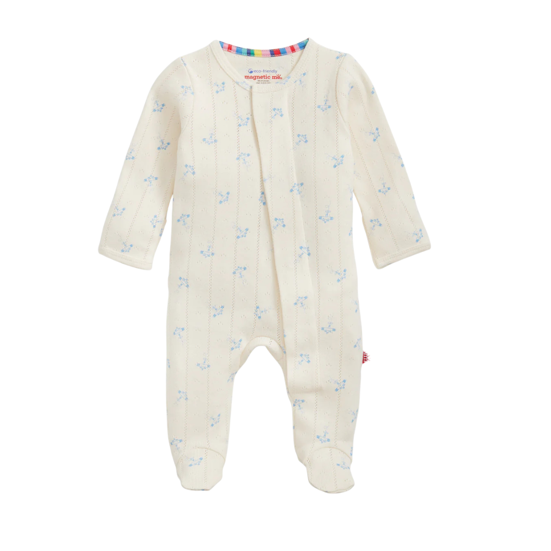 Our organic cotton pointelle magnetic footie, is made with magnetic closures that are quick, quiet, and a lifesaver for middle-of-the-night changes. Naturally soft + breathable for year-round wear, it's the perfect layette present made of organic cotton + delicate pointelle stitching.