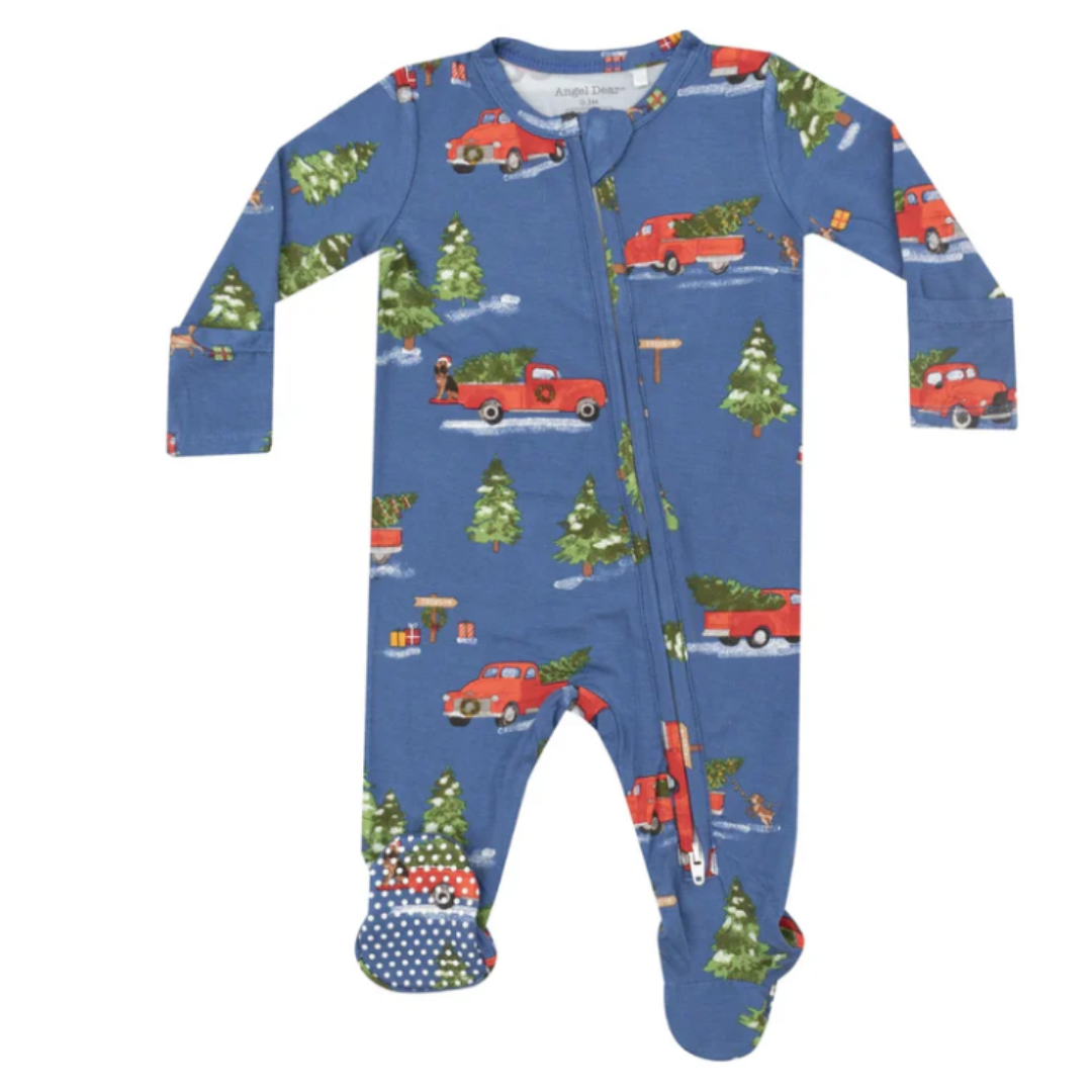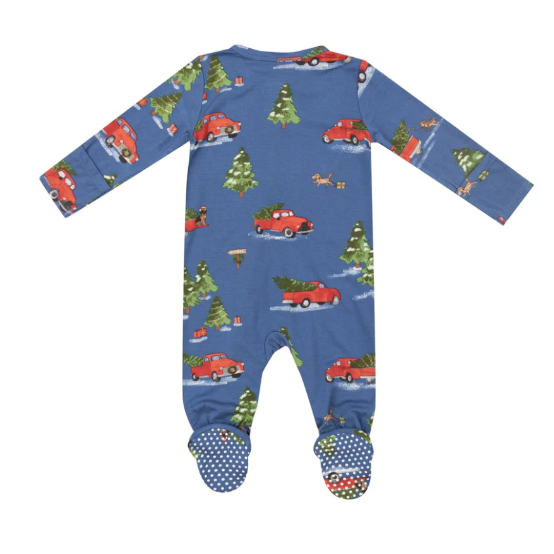 This zipper footie is perfect for those good night dreams. It features a Red Vintage Truck hauling a Christmas Tree on a Royal Blue background. Fold over cuffs to prevent scratches, grippers on the bottom of feet and 2 way zipper with a zipper guard. It is made from bamboo viscose making it so soft and breathable and not to mention great for sensitive skin!