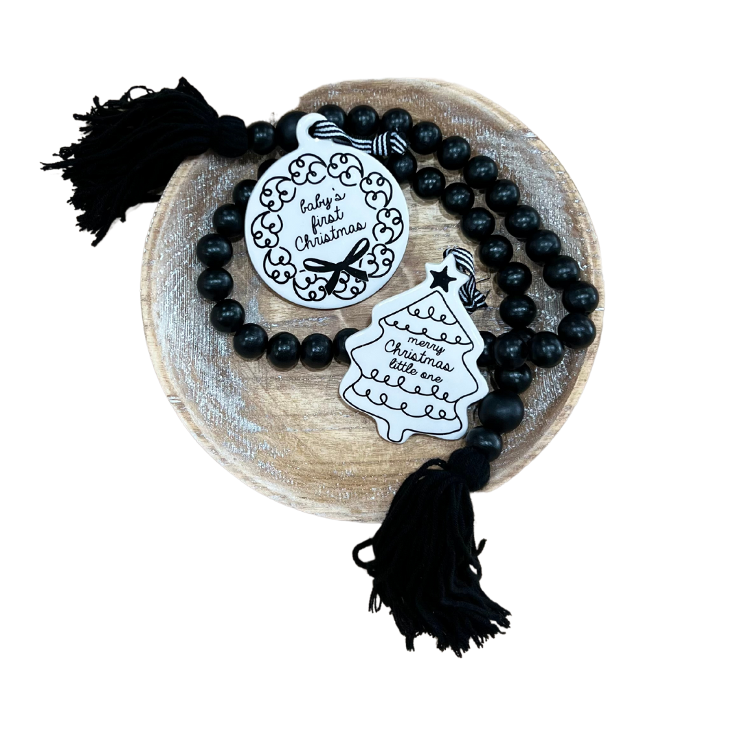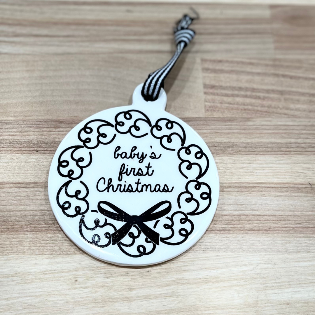 Christmas ornaments that are in the shape of a circle with the saying baby's first Christmas and the other is the shape of a Christmas tree with the saying merry Christmas little one. Perfect for the holiday season to remember each year.