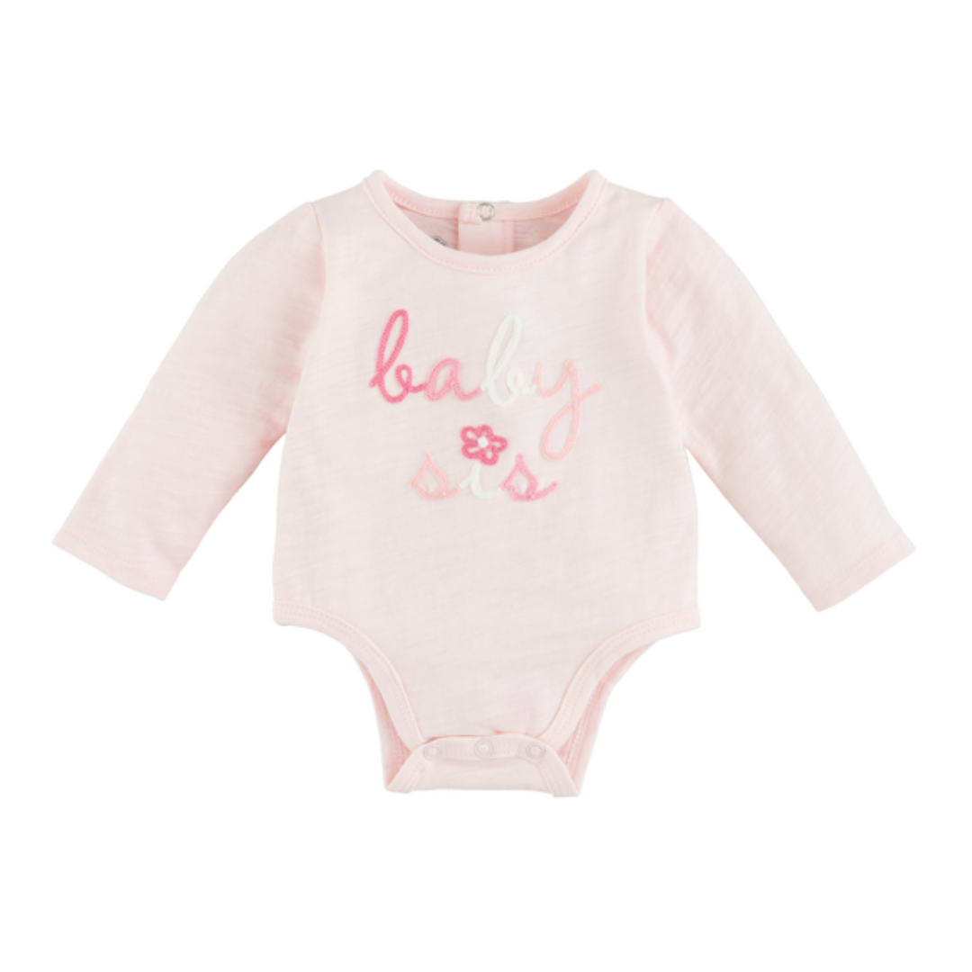 Super sweet onesie that has baby sis embroidered in different shades of pink. It has snaps on the bottom for easy changing.
