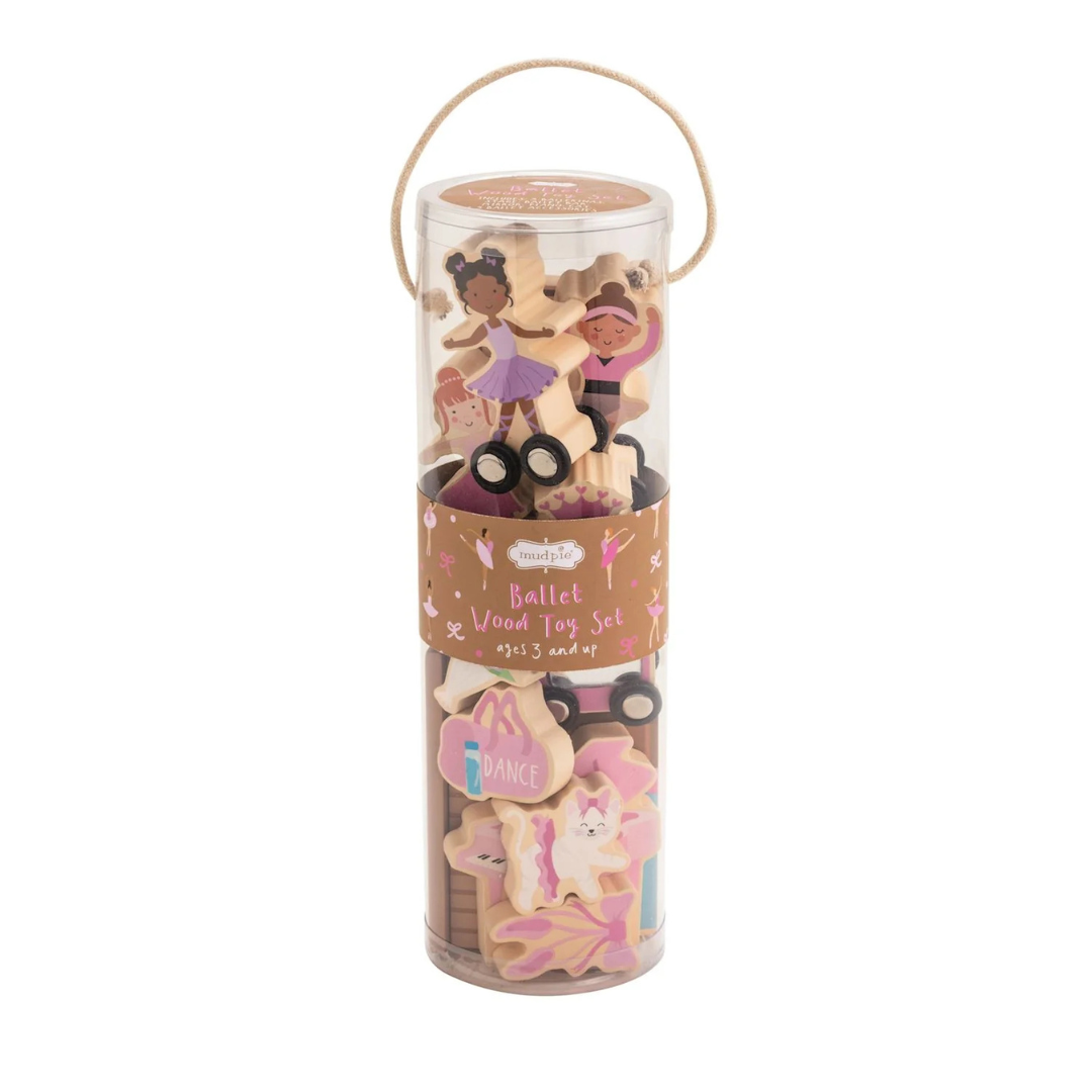 The ballet wood toy set is a 13-piece set that offers a range of wooden ballet items and ballerinas. With three ballerinas, stage, ballet bar, mirror, piano, cat, and three ballet accessories this set provides endless possibilities for imaginative play. Crafted from durable pine wood, it ensures safety for children aged 3 and up. This toy set encourages the development of fine motor skills, creativity, and problem-solving abilities in young children, making it an ideal choice for hours of engaging play.