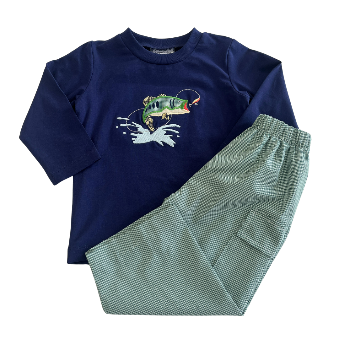 This 2pc set is perfect for the future fishermen in the family. It features a navy long sleeve t-shirt with an a bass applique and fishing lure. It comes with matching green gingham pants with side pocket detailing.