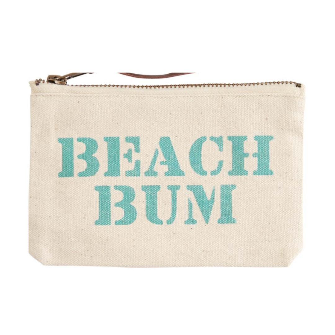 6 1/2 x 4 inch zippered canvas pouch with Aqua "BEACH BUM" stamped on front. Great gift for the beach lover letting them easily find their keys, money and cards in their beach bag.