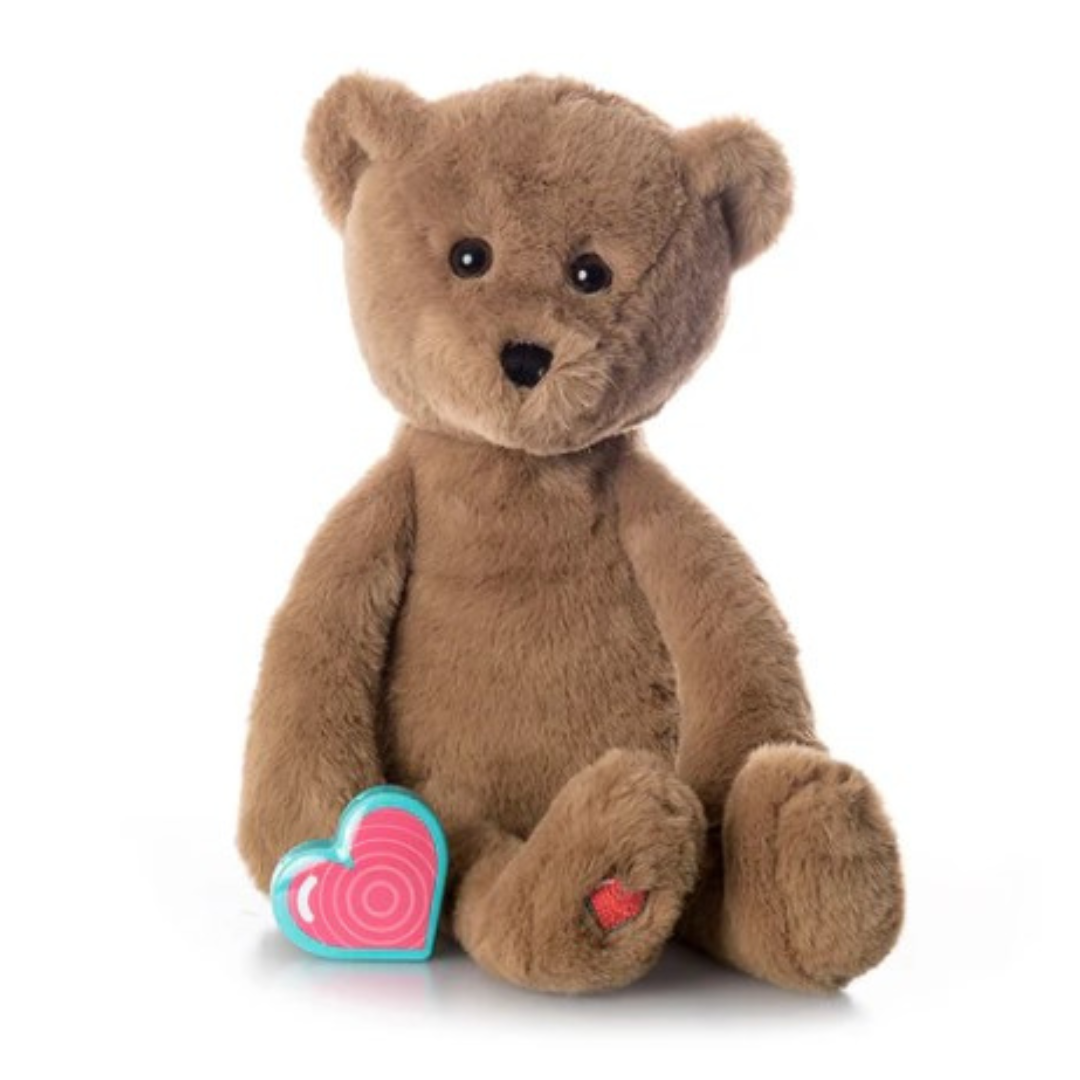 The vintage bear kit includes a 13- 15" stuffed pink bear and an easy-to-use heart-shaped recorder. The bear is perfect to cuddle, made with a soft fleece-like material with poly fiber stuffing and a velcro closure in the back where the recorded heartbeat or message is secured.