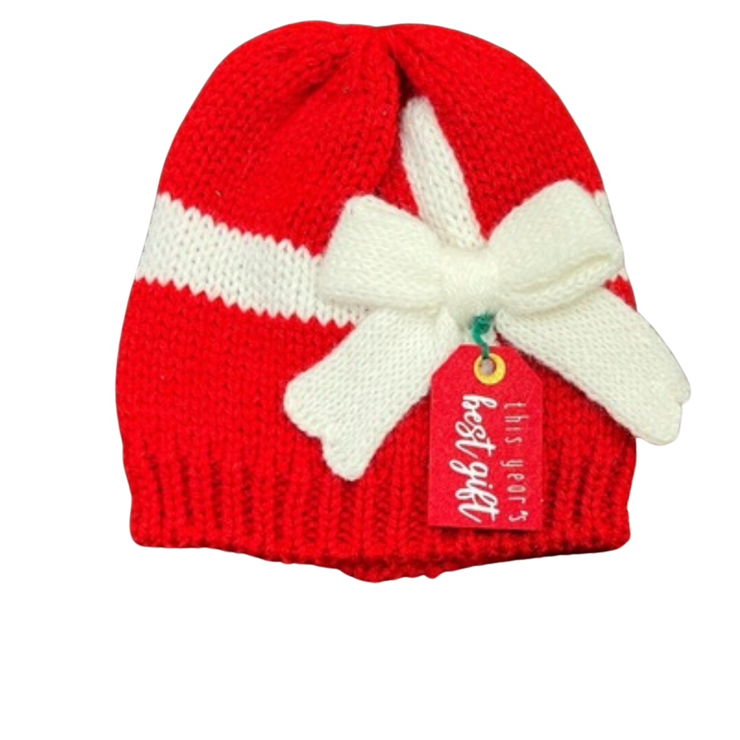 Knit yarn hat features dimensional bow and printed felt "gift tag" that says "Best Gift Ever"! How true is that?!!