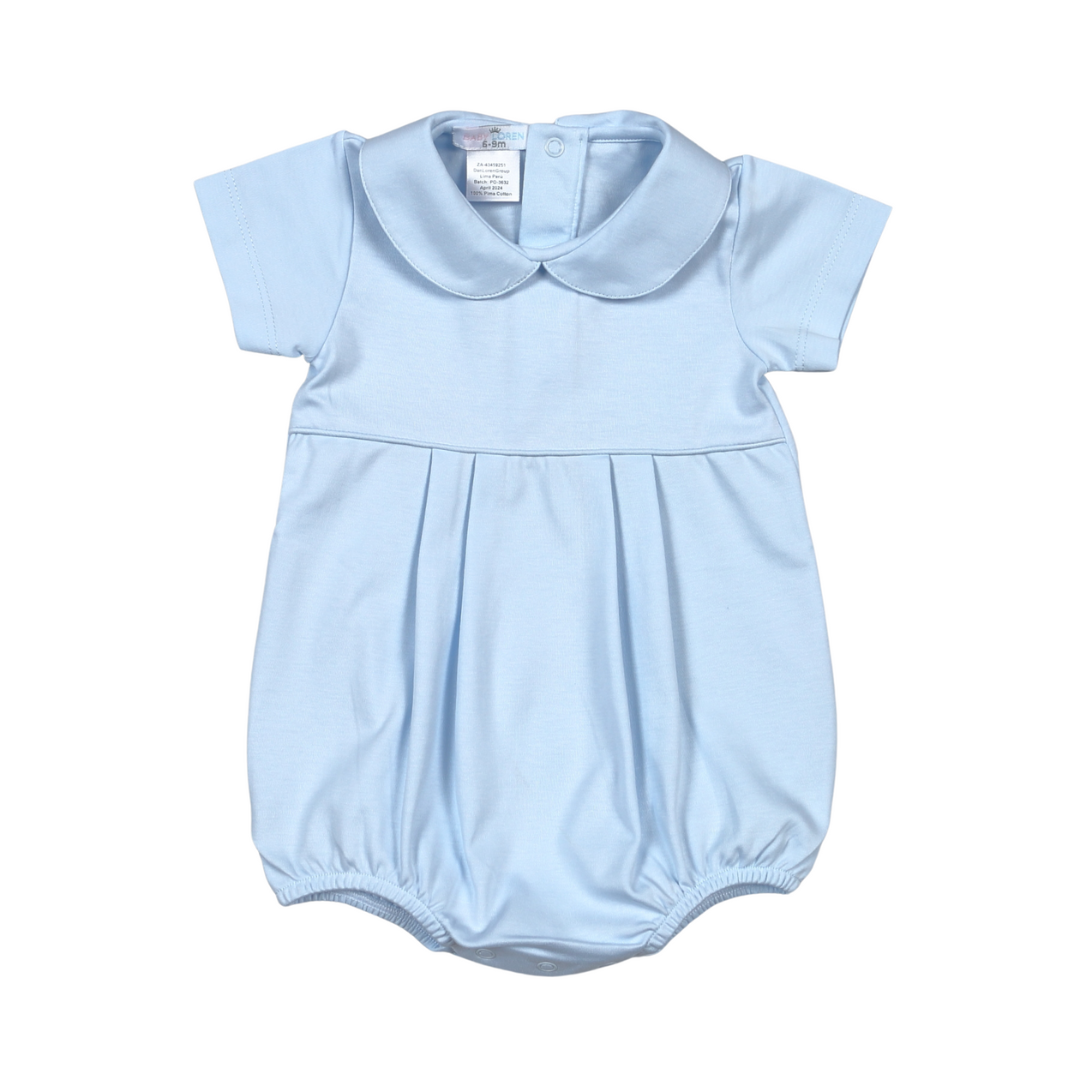 Soft, simple, and timeless — this light blue pima cotton bubble is a wardrobe staple for baby boys. Crafted from 100% premium Peruvian Pima cotton, it features a classic Peter Pan collar and softly gathered waist for a sweet, traditional silhouette. The short sleeves and light blue tone make it perfect for warmer days, while elastic leg openings and convenient snaps ensure comfort and ease for both baby and parent.