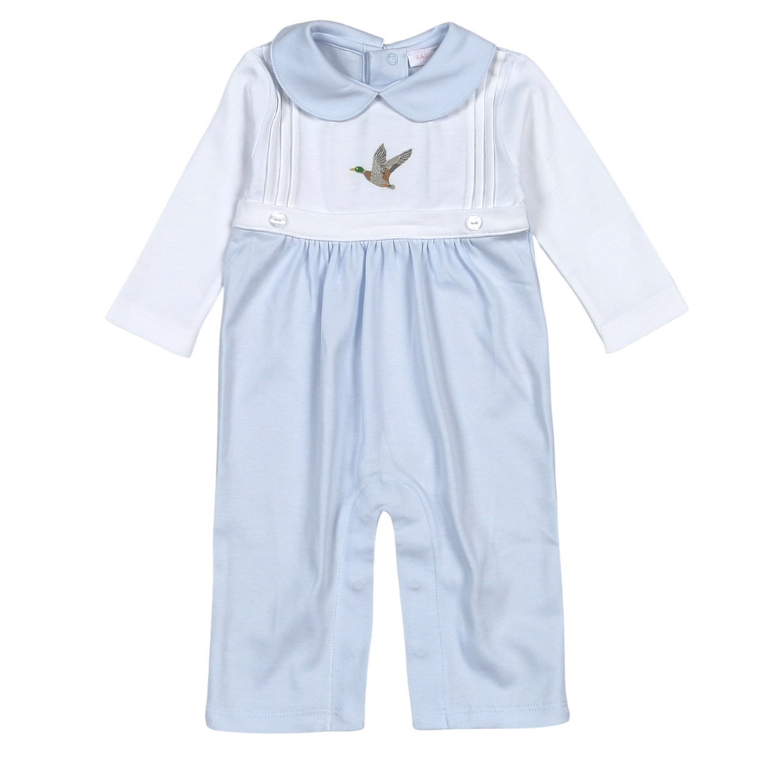 Dress your little one in timeless style with this beautifully crafted Hand-Embroidered Pima Cotton Romper. Made from 100% Peruvian Pima cotton, this heirloom-quality piece features a delicately embroidered mallard duck on the chest, classic pintuck detailing, and a soft Peter Pan collar in coordinating baby blue. The snap closures at the legs ensure easy changes, while the long sleeves keep baby cozy in cooler weather.