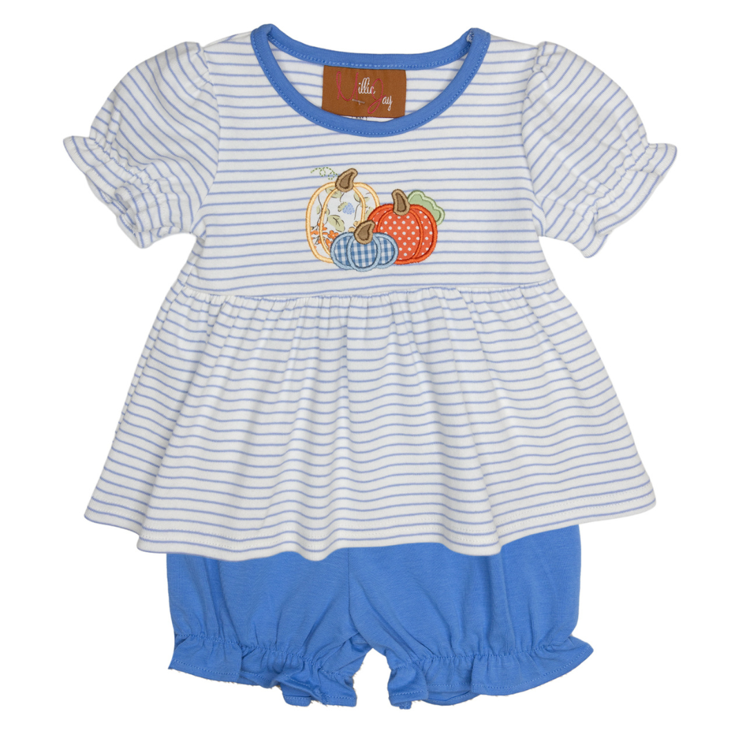 This charming two piece set includes a white and royal blue striped tunic with three printed applique pumpkins along the chest and matching bloomers. Coordinate with matching sibling outfits!