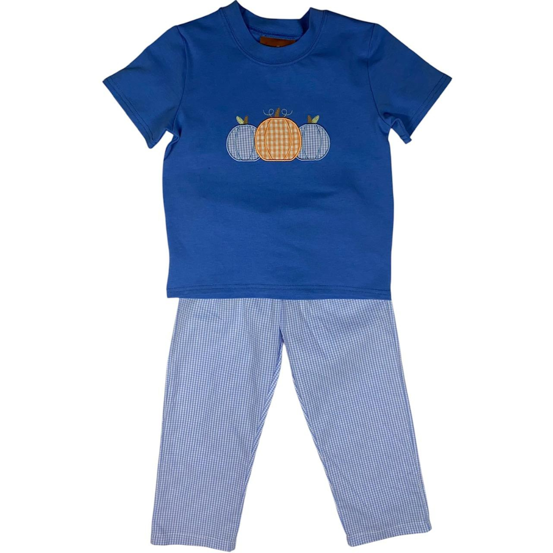This charming two piece set includes a royal blue short sleeve shirt with three applique gingham pumpkins along the chest and matching blue gingham pants. Coordinate with matching sibling outfits!