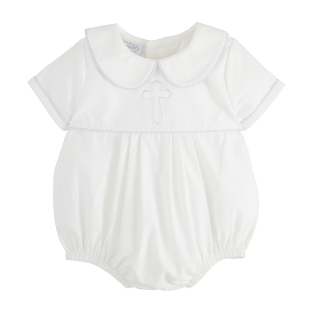 This charming embroidered poplin bubble is a delightful addition to any little one's wardrobe. Crafted with meticulous attention to detail, it showcases a classic peter pan collar that adds a touch of timeless elegance. The contrast piping enhances the overall design, providing a subtle yet stylish accent. Designed for convenience and comfort, the bubble features inner leg snaps, making diaper changes a breeze.