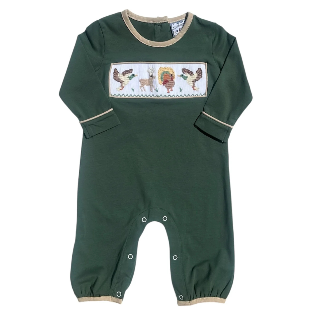 This mossy green romper features smocked detailing across the chest which has mallards, bucks, and turkeys. Coordinate with matching big brother outfit!