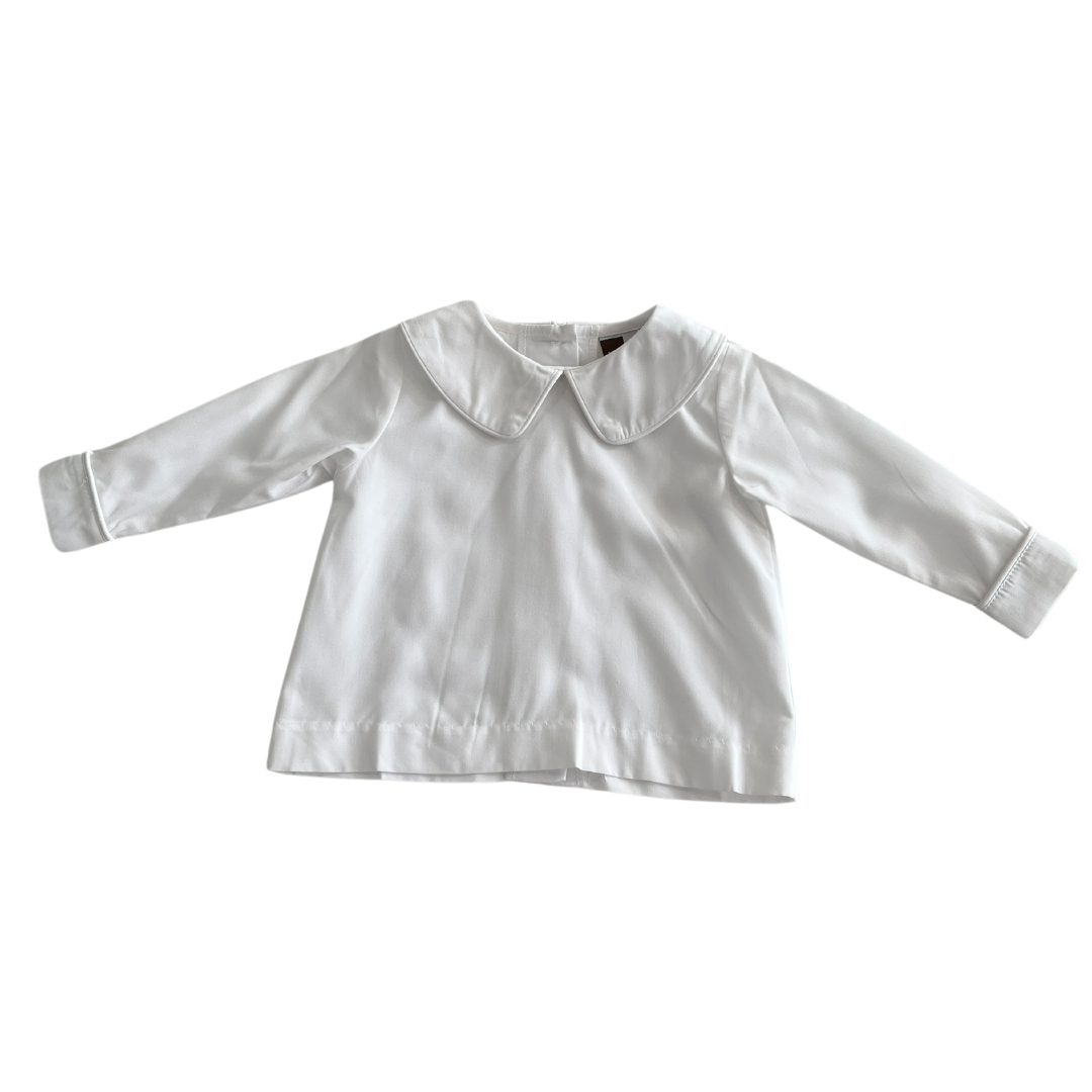 This is the perfect shirt for special occasions or holidays. It features a peter pan collar and buttons along the back and on the sleeves.