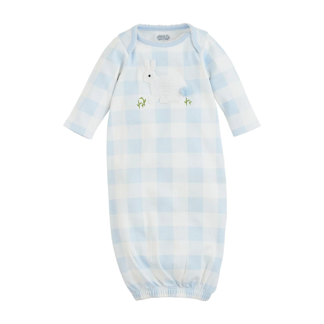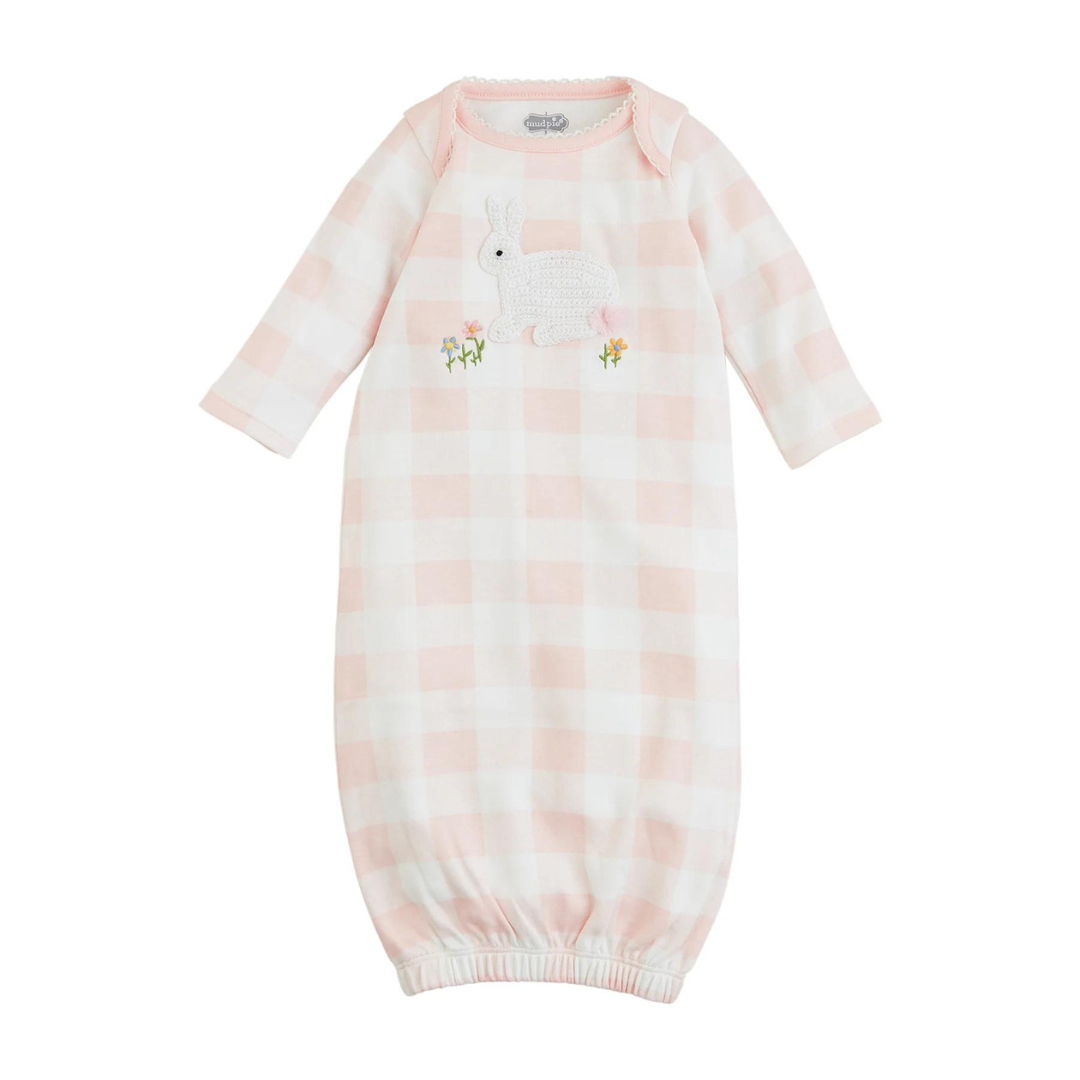 Some BUNNY will be very cute in this gown. The interlock gown features a crochet knit applique in the center that features a bunny with a pom pom tail, scalloped neckline, and a gingham print pattern.