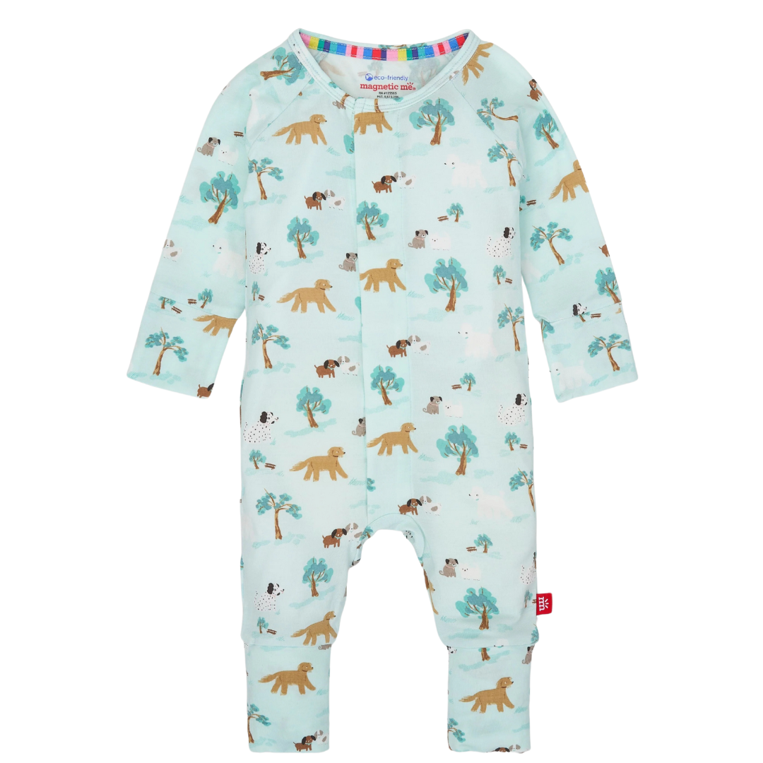 Meet our grow with me convertible coverall, a one-piece that lets you adjust its features as your baby grows. magnetic closures ensure quick and quiet changes, and foldover cuffs for hands and feet extend the length and life of the coverall. made of eco-friendly TENCEL™ modal that's silky soft, breathable, and gentle on sensitive skin—it's the one piece of clothing baby won’t outgrow in the blink of an eye. This print features various breeds of dogs in a park setting.