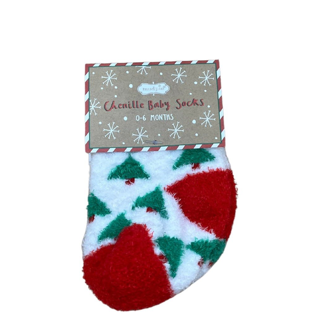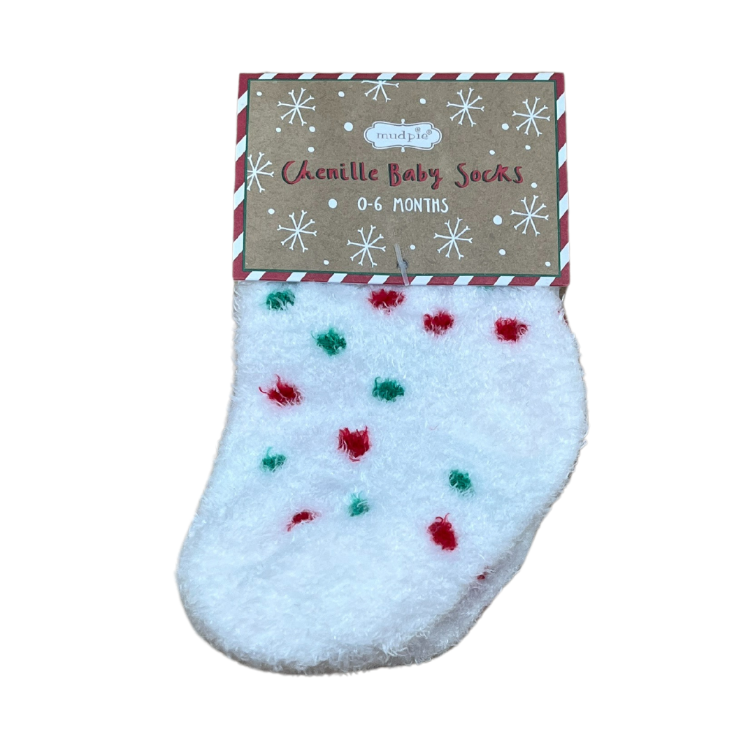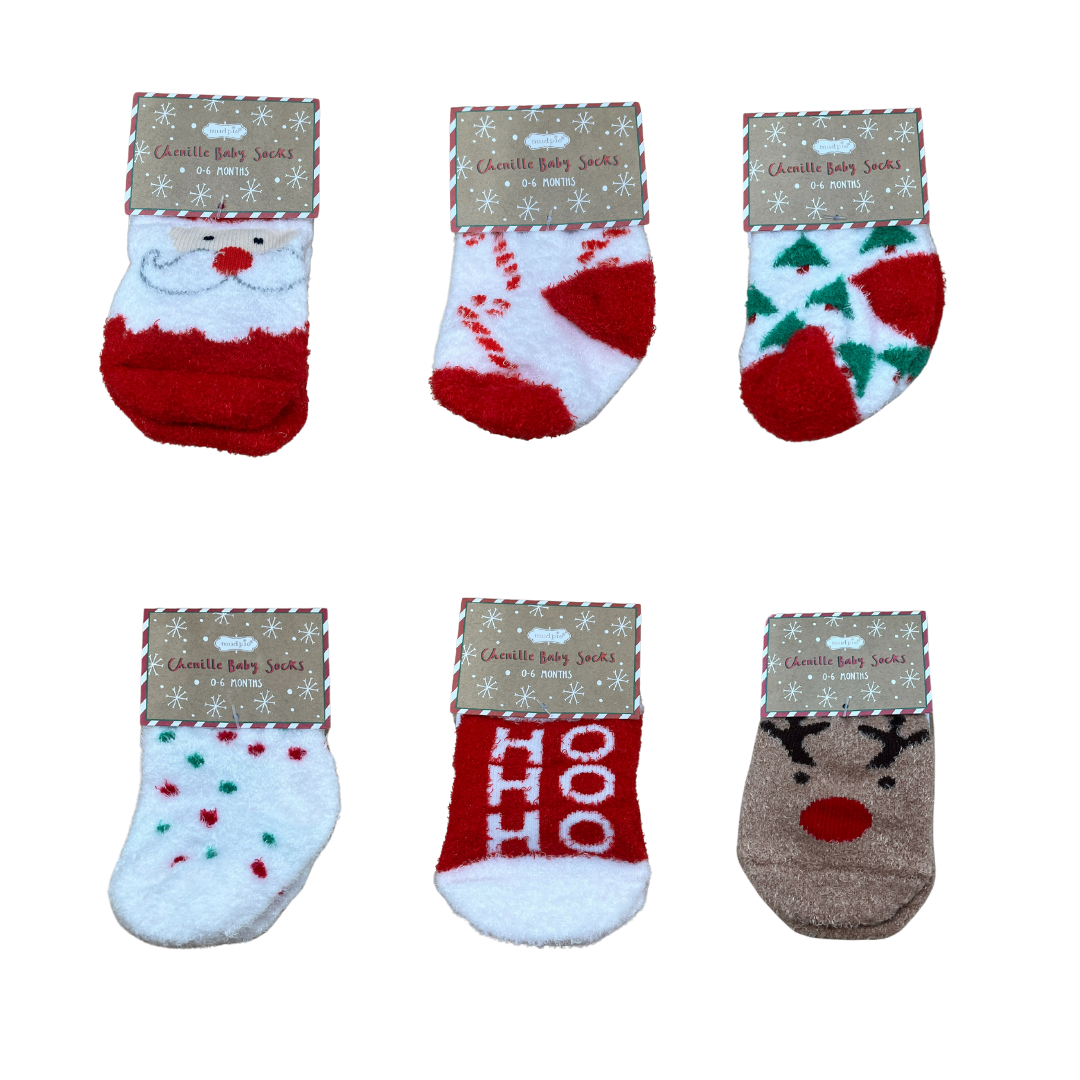 These baby socks are made of super soft chenille! They come in a holiday assorted variety and are size 0-6 month. They would make the perfect stocking stuffer!