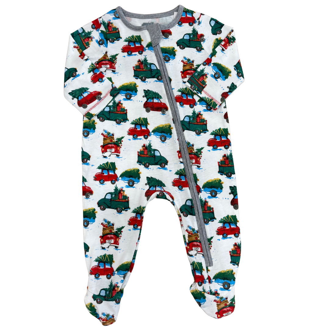 Super cute vintage look from Mudpie that features Christmas trees loaded onto trucks. This is perfect for the Christmas season and would love adorable on any baby!