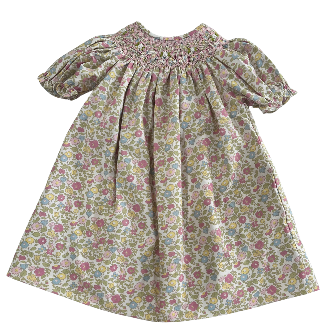 This adorable dress is a must have in your little one's wardrobe for any special occasion! It features a colorful floral print with a smocked neckline with floral detailing, cinched cap sleeves, and buttons on the back. Coordinate with matching bubble for baby sister.