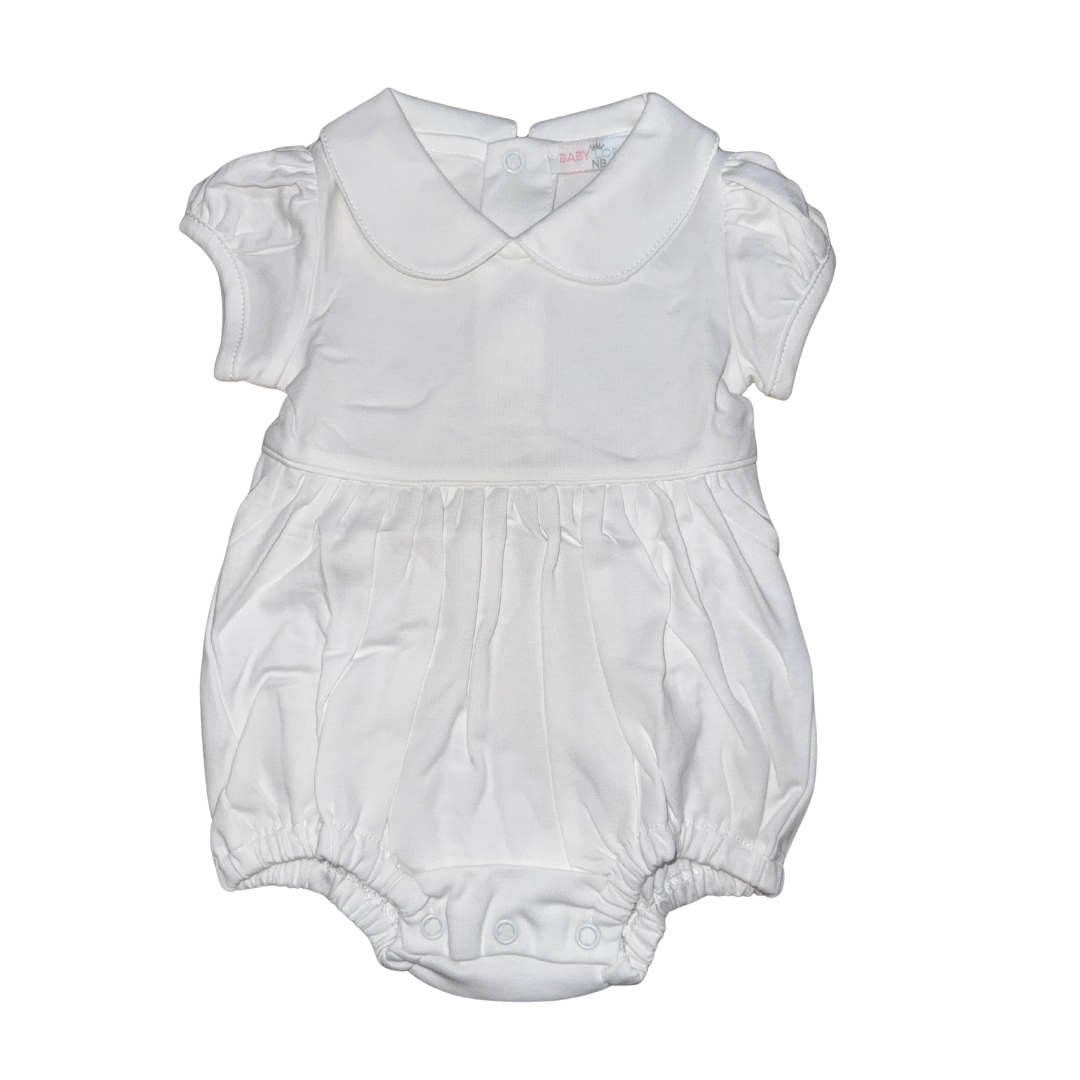 Simple, timeless, and irresistibly soft — this Classic White Bubble Romper is a must-have in any baby’s wardrobe. Crafted from 100% Peruvian Pima cotton, it features a sweet Peter Pan collar, short puff sleeves, and a gently gathered waist for a traditional silhouette. The clean white color offers a fresh, versatile look perfect for everyday elegance or special occasions.