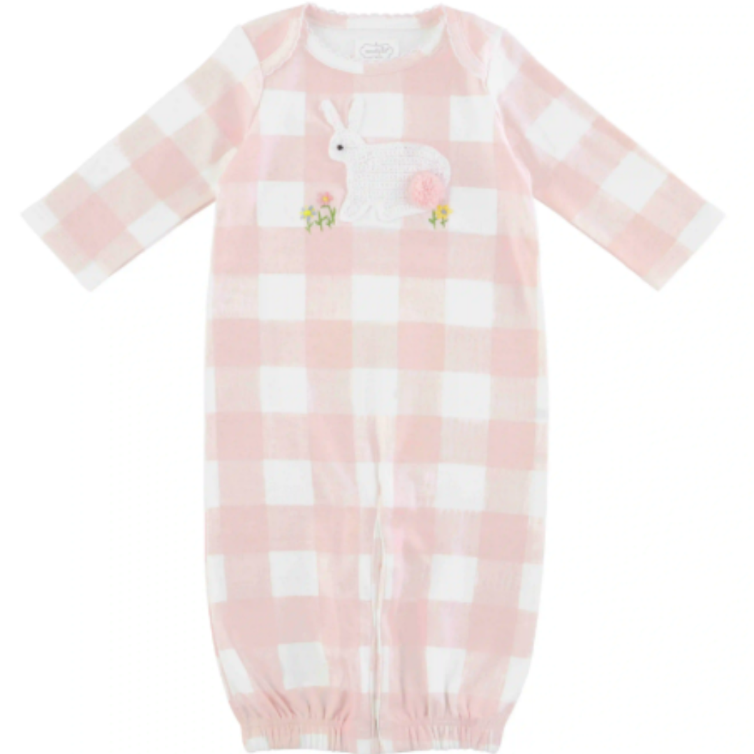Some BUNNY will be very cute in this Pink Bunny Sleeper Gown from Mud Pie. The interlock gown features a crochet knit applique in the center that features a bunny image. The gown features a pink and white gingham print pattern. This gown can easily convert from a gown to a sleeper.