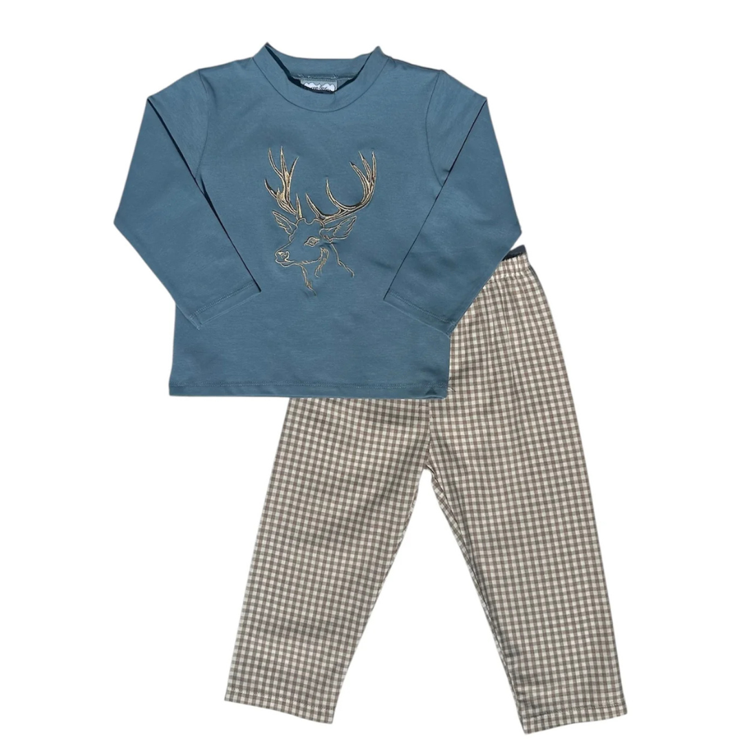 This slate blue long sleeve shirt features an embroidered deer on the front and coordinating khaki gingham pants.