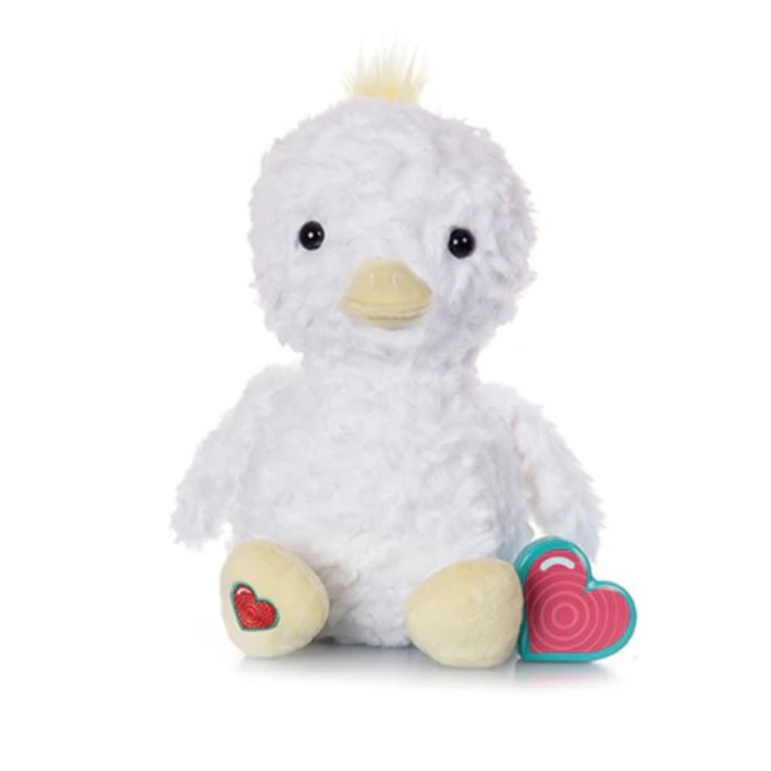 The duck kit includes a 12" stuffed duck and an easy-to-use heart-shaped recorder. The duck is perfect to cuddle, made with a soft fleece-like material with poly fiber and a velcro closure in the back where the recorded heartbeat or message is secured.