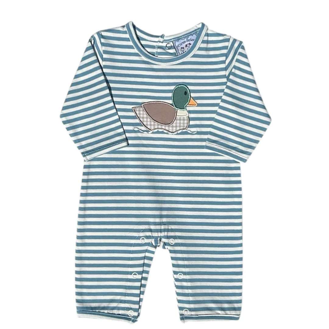 This blue and white striped long sleeved romper features an applique mallard duck on the front and snaps at the bottom for easy changing.