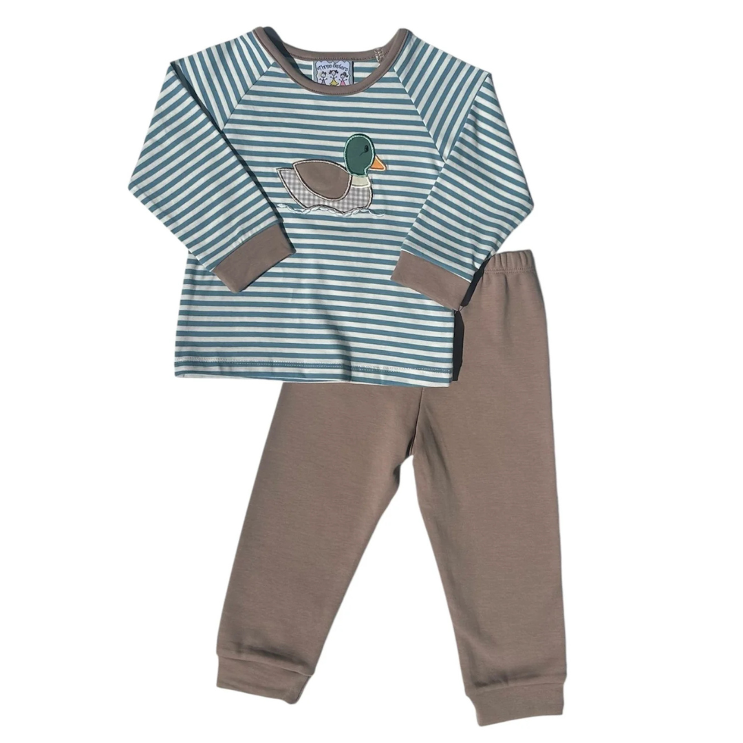 This two piece set includes a brown and white striped tee with an applique mallard on the front and matching brown pants.