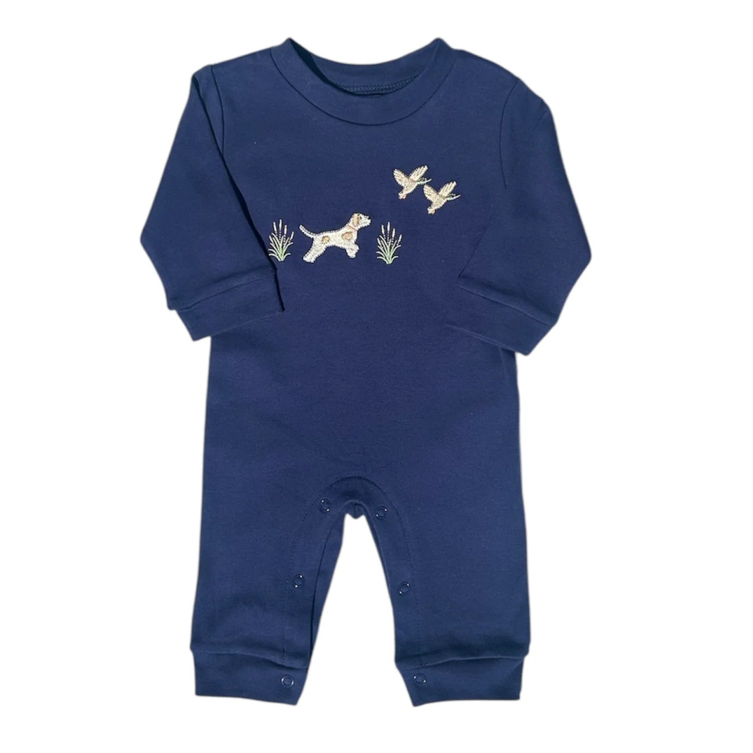 This navy long sleeve romper features embroidered mallard ducks and a hunting dog. It has snaps along the bottom for easy changing.