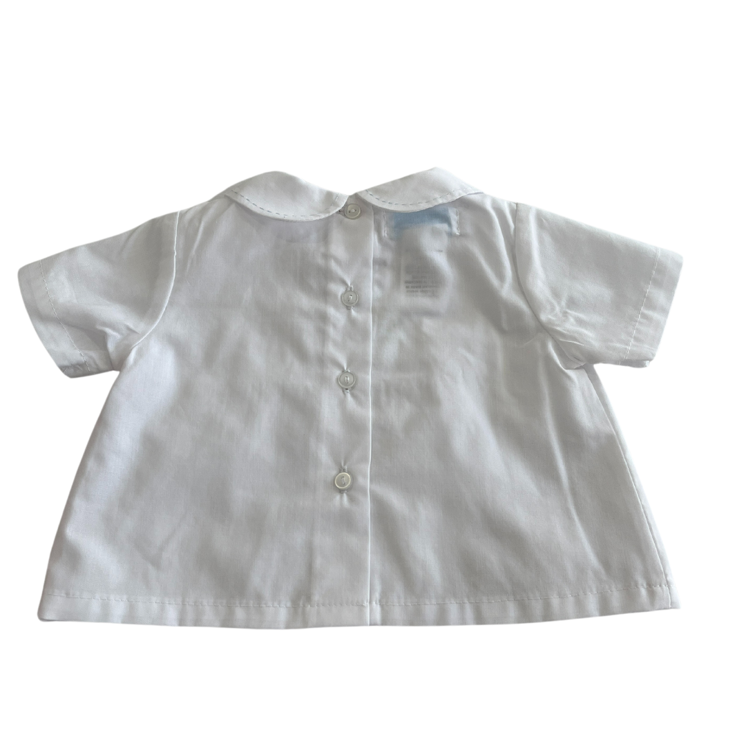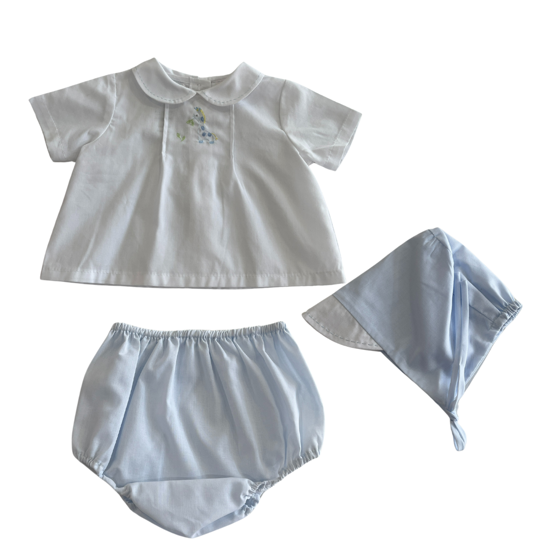 This short sleeve diaper set is perfect for little boys on the move! Features a delicate embroidered edge trim in light blue for just the right amount of detail. It comes with the matching blue hat.