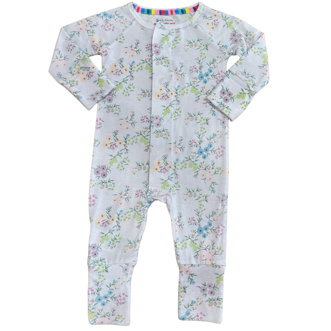 Meet our grow with me convertible coverall, a one-piece that lets you adjust its features as your baby grows. magnetic closures ensure quick and quiet changes, and foldover cuffs for hands and feet extend the length and life of the coverall. made of eco-friendly TENCEL™ modal that's silky soft, breathable, and gentle on sensitive skin, this is one piece of clothing baby won’t outgrow in the blink of an eye. It features a lilac and pastel floral print.