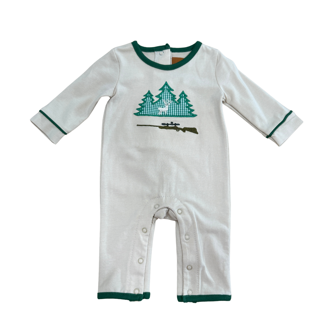 This is a must have for the fall! It features a khaki romper with green trim and an applique deer hunter scene on the chest. Coordinate with matching big brother set.