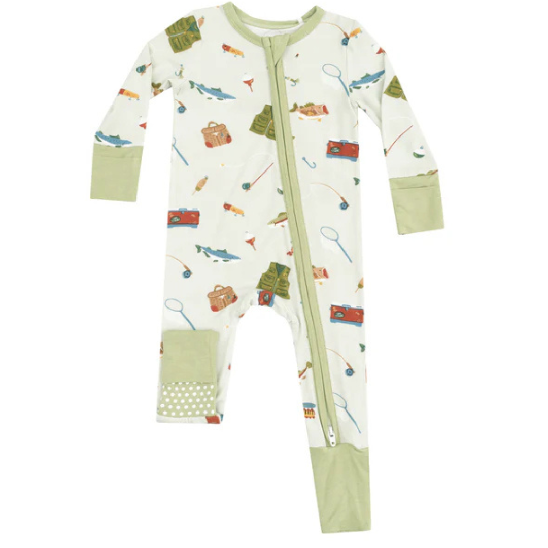 Our signature 2 way zipper romper makes changing your baby a Snap! (or as we like to say a Zip!) Super soft Viscose from Bamboo fiber fabric and Angel Dear's signature prints will keep the oohs and aahs a- coming. Our 2 Way Zipper Rompers are designed to meet snug-fitting standards—no chemicals needed! Keep it cozy, cute, and safe by wearing these PJs nice and snug! It features various fishing things.