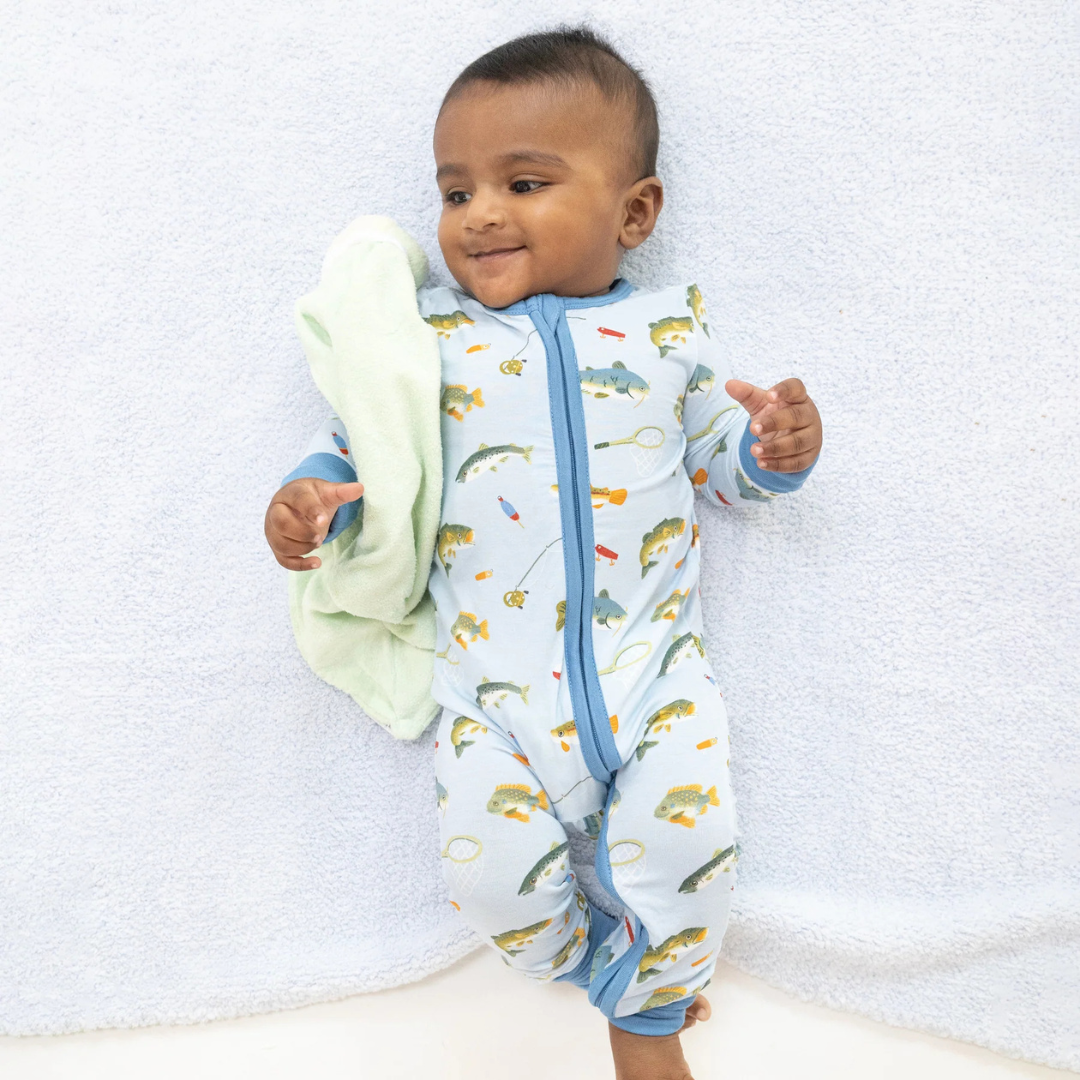 This zipper romper features various types of fish, fishing lures and rods. It has 2 way zippers, gripper dots on the bottom of feet, zipper guard and fold over cuffs at the hands and feet. This pajama is made from bamboo viscose making it so soft and breathable and not to mention great for sensitive skin!