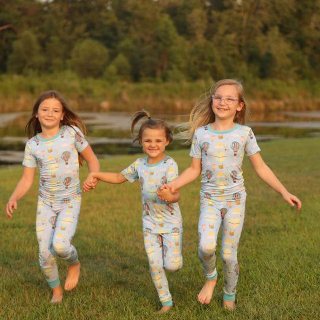 How fun is this short sleeve and pant set?! It features a fun hot air balloon with teal trim around the neck and waist. It is made from bamboo viscose and is perfect for toddlers with sensitive skin!