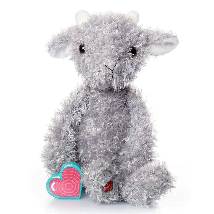 The vintage goat kit includes a 15" stuffed goat and an easy-to-use heart-shaped recorder. The goat is perfect to cuddle, made with a soft fleece-like material with poly fiber stuffing and a velcro closure in the back where the recorded heartbeat or message is secured.
