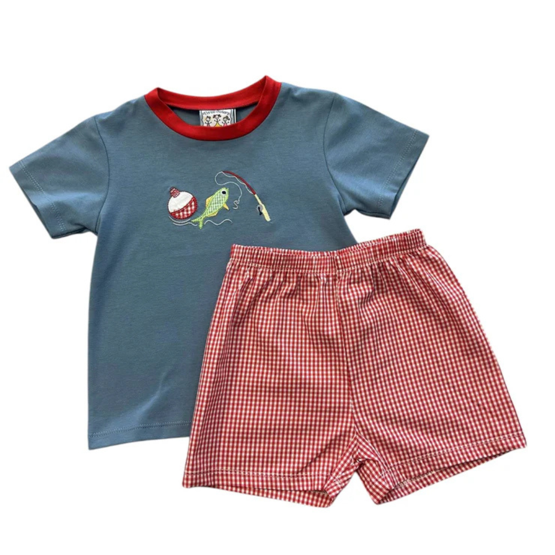 This short set is perfect for the future fisherman in your family. The short sleeve shirt features an appliqued fish, bobber and rod with red trim around the neck and matching red gingham shorts. Pair this with the matching boys bubble for little brother.