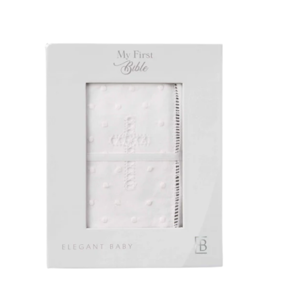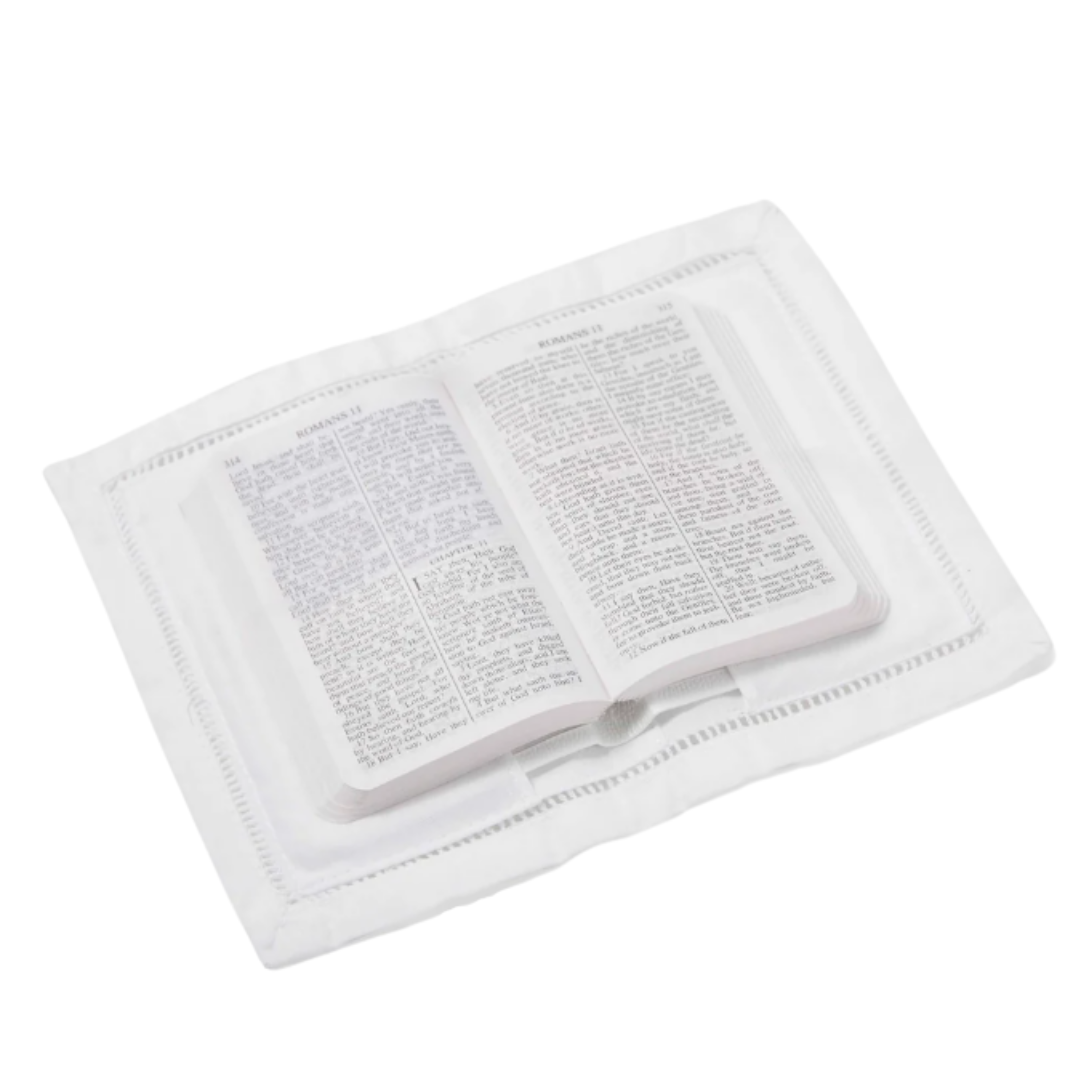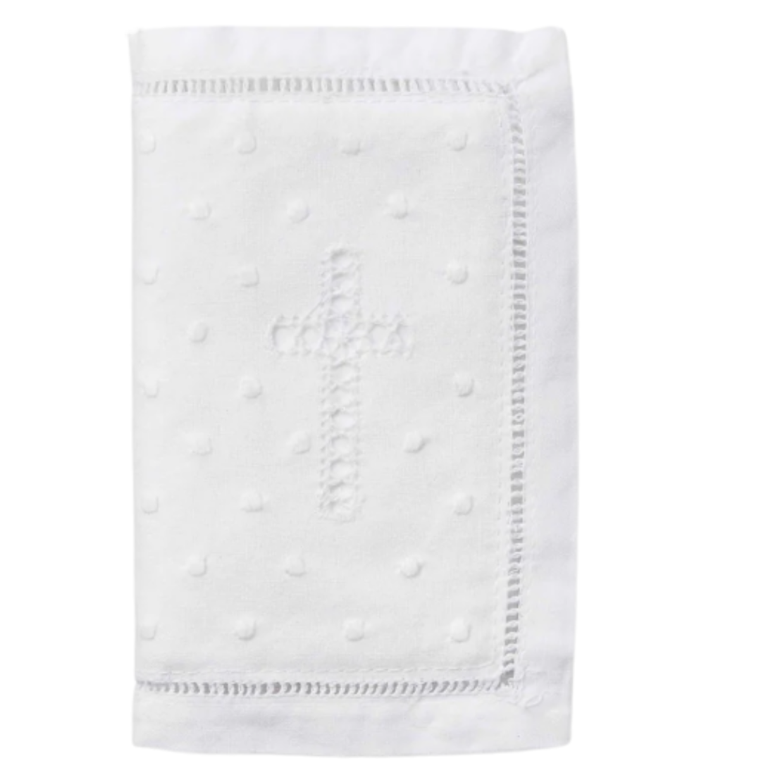 Bibles are one of the most cherished items in a person's home, always kept close on bedsides or dressers or bookshelves. This elegant Hand-embroidered Heirloom Bible Cover is particularly special because it is made to one day become part of a wedding bouquet when your little one grows to wed. A beautiful cross is stitched in the center of the cloth cover with a delicate lace trim.