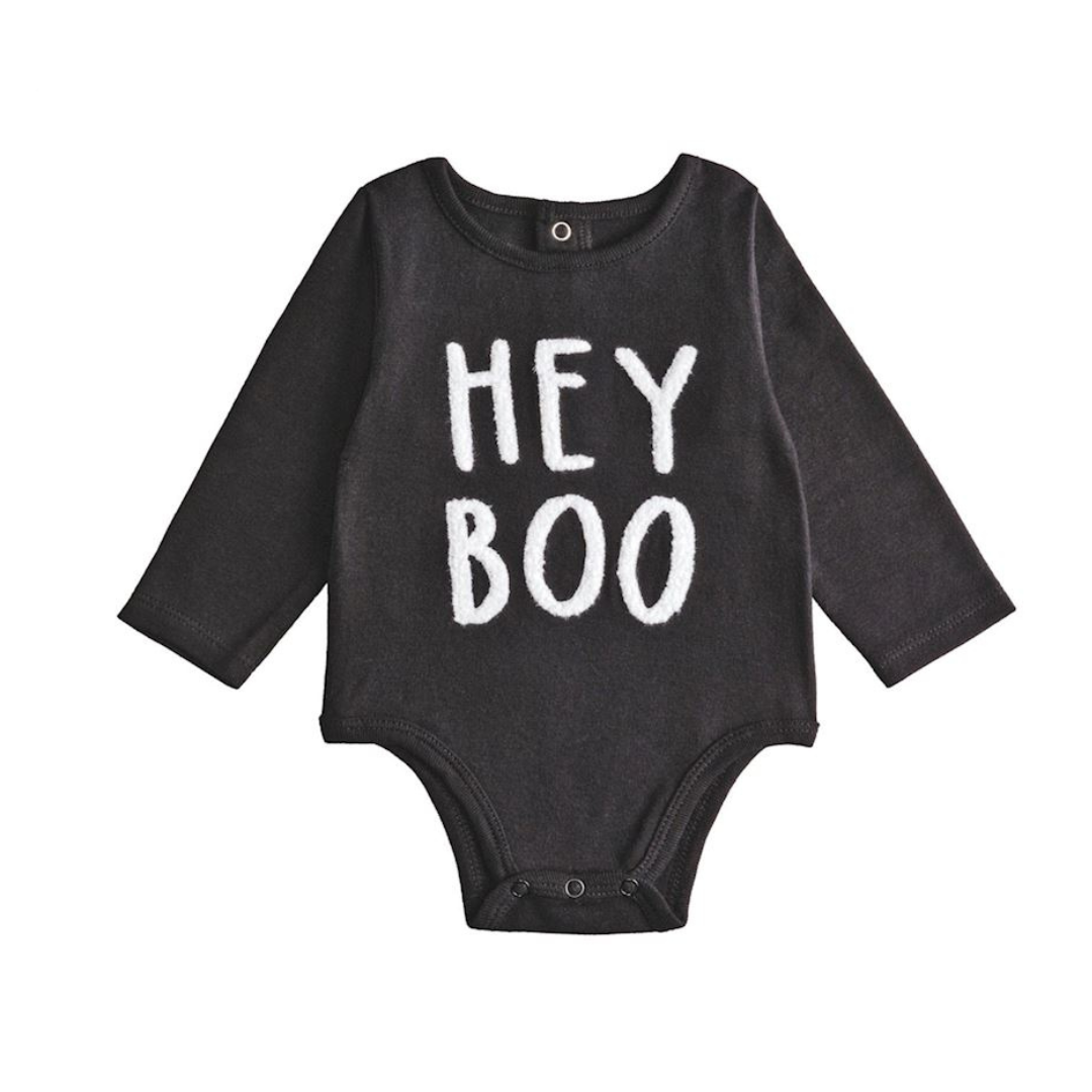 This is the perfect onesie for Halloween. It is a cotton rib long sleeve crawler with boucle Hey Boo sentiment on the front and inner leg snaps.