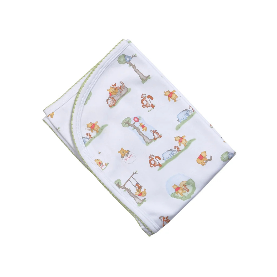 Oh so soft and adorable, this must have receiving blanket features a classic Winnie the Pooh print with a sage green scalloped trim. Grab the matching beanie and convertible gown to complete the collection. It is made from super soft and comfortable pima cotton.