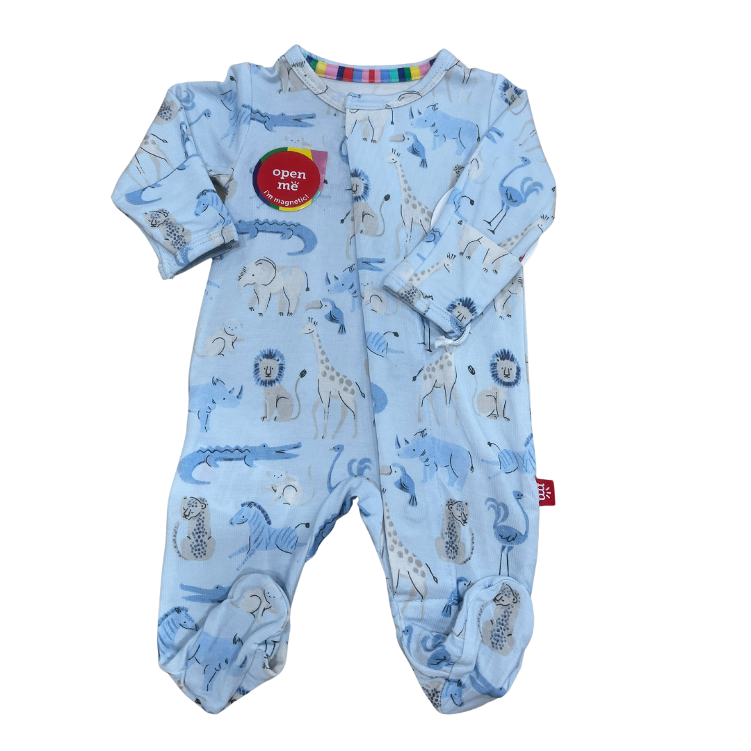 Our parent favorite footie is an everyday (and night) essential with magnetic closures that make dressing easy. magnets are quick, quiet, and a lifesaver for middle-of-the-night changes. eco-friendly TENCEL™ modal is silky soft, breathable, and gentle on sensitive skin. temperature-regulating properties will keep warm in winter, you cool in summer, and oh-so comfortable year round. It features a blue jungle print.