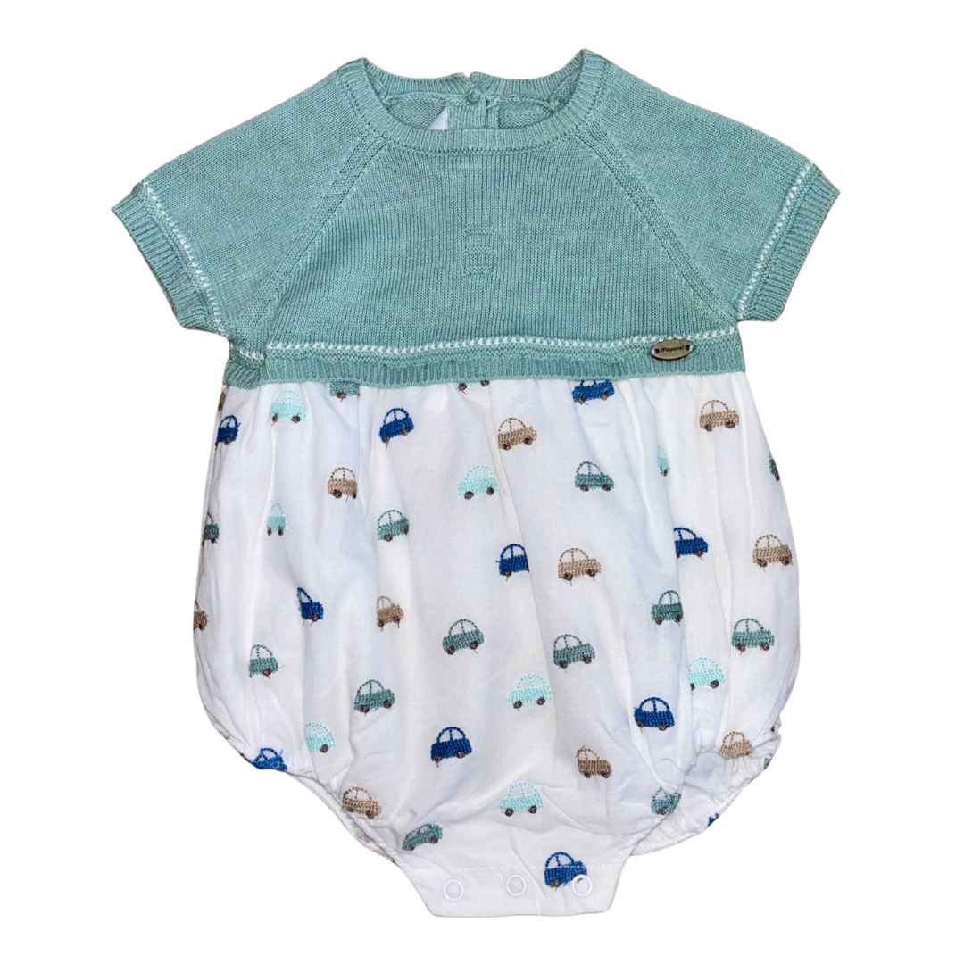 This adorable bubble features a knit mint top half with stitched multi colored cars on the bottom half. It has three snaps at the end for easy changing.