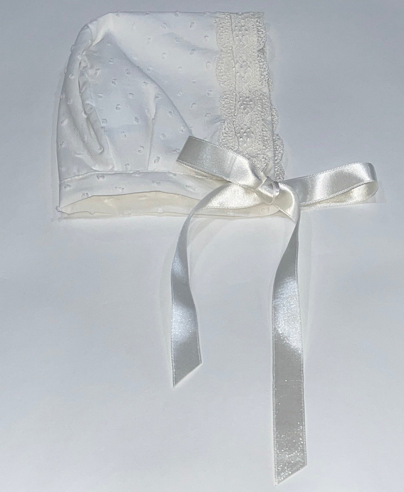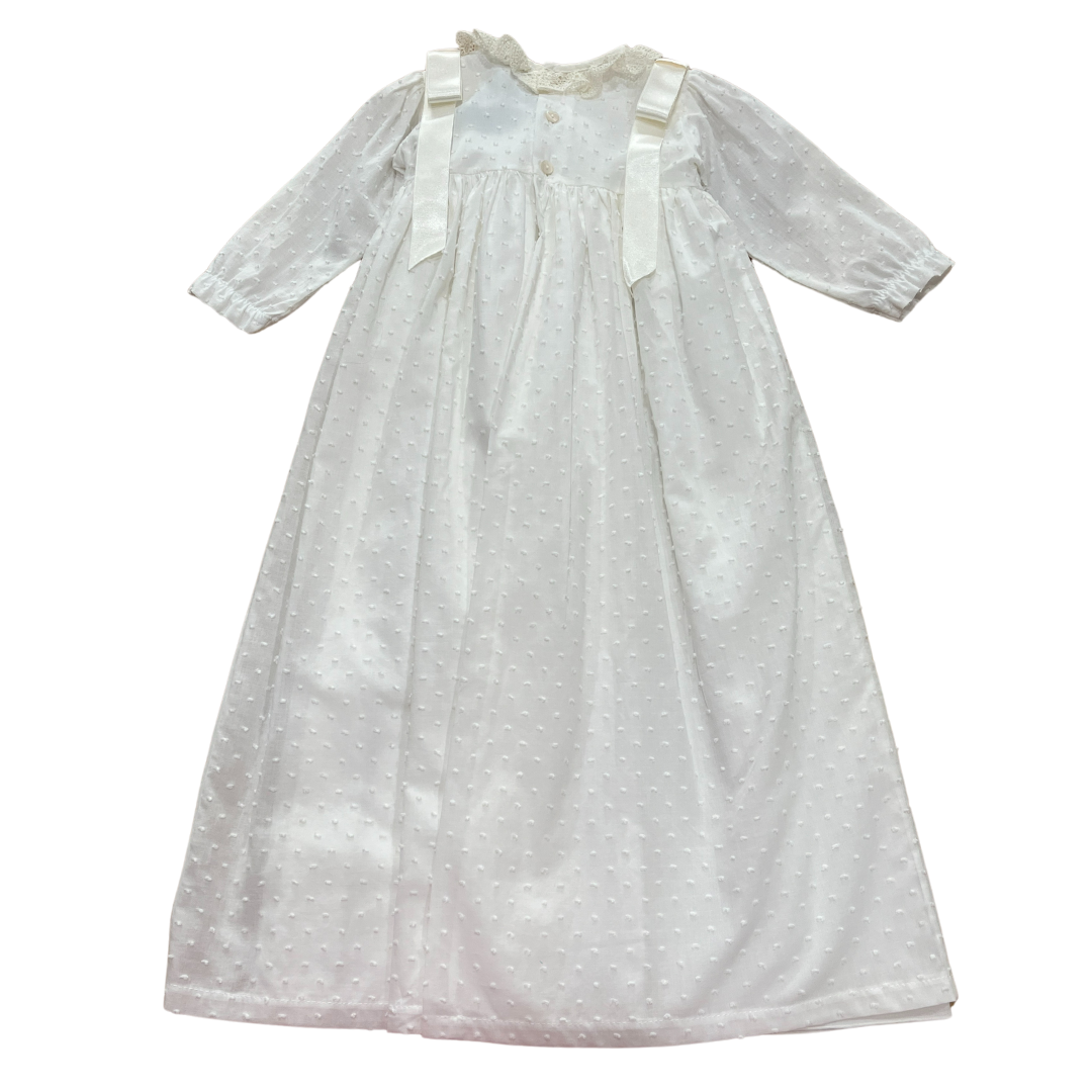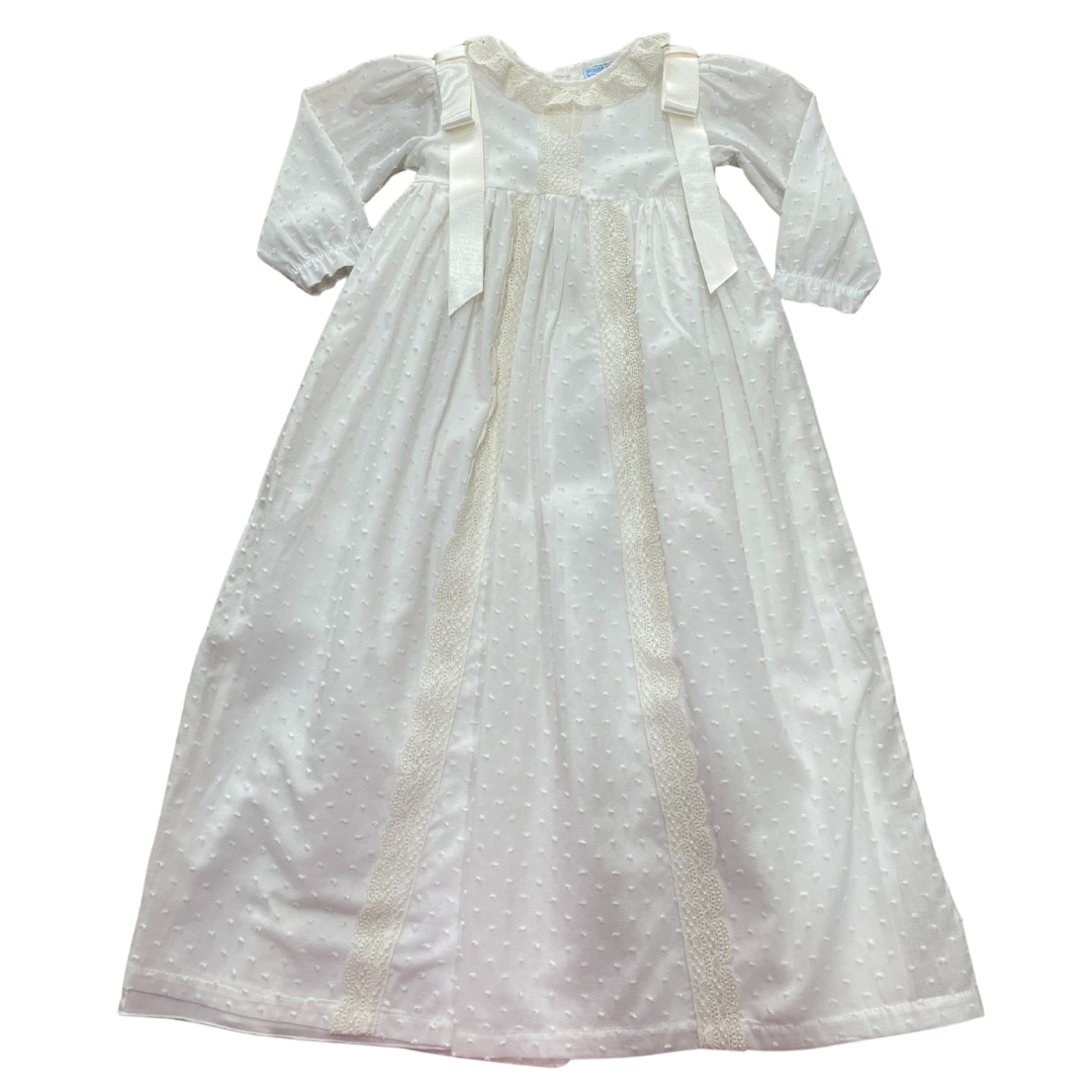 Adorable pin dot and lace detailed ceremonial dress with satin bows tied at the shoulder. This is perfect for any occasion that baby girl is going to celebrate! Includes the matching bonnet!