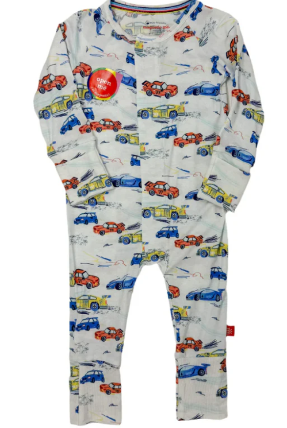 Meet our grow with me convertible coverall, a one-piece that lets you adjust its features as your baby grows. magnetic closures ensure quick and quiet changes, and foldover cuffs for hands and feet extend the length and life of the coverall. made of eco-friendly TENCEL™ modal that's silky soft, breathable, and gentle on sensitive skin, this is one piece of clothing that baby won’t outgrow in the blink of an eye. It features different models of race cars in yellow, blue and brunt red speeding across a muted blue background.