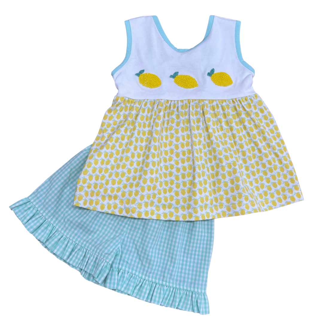 This adorable set features a tank top with a lemon print, gingham bow on the back and the matching mint gingham shorts with ruffles at the bottom. It matches perfectly with the lemon love bubble.