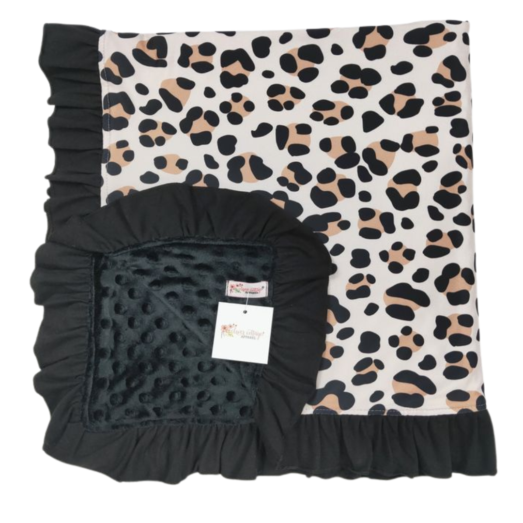 This minky baby blanket is a must have item for every newborn. It is the perfect baby shower gift, and will quickly become a staple for every day use. A perfect blanket that fits through the toddler years: (car seat, stroller, or playtime). It measures 29x43 inches and features a leopard print with ruffled edges.
