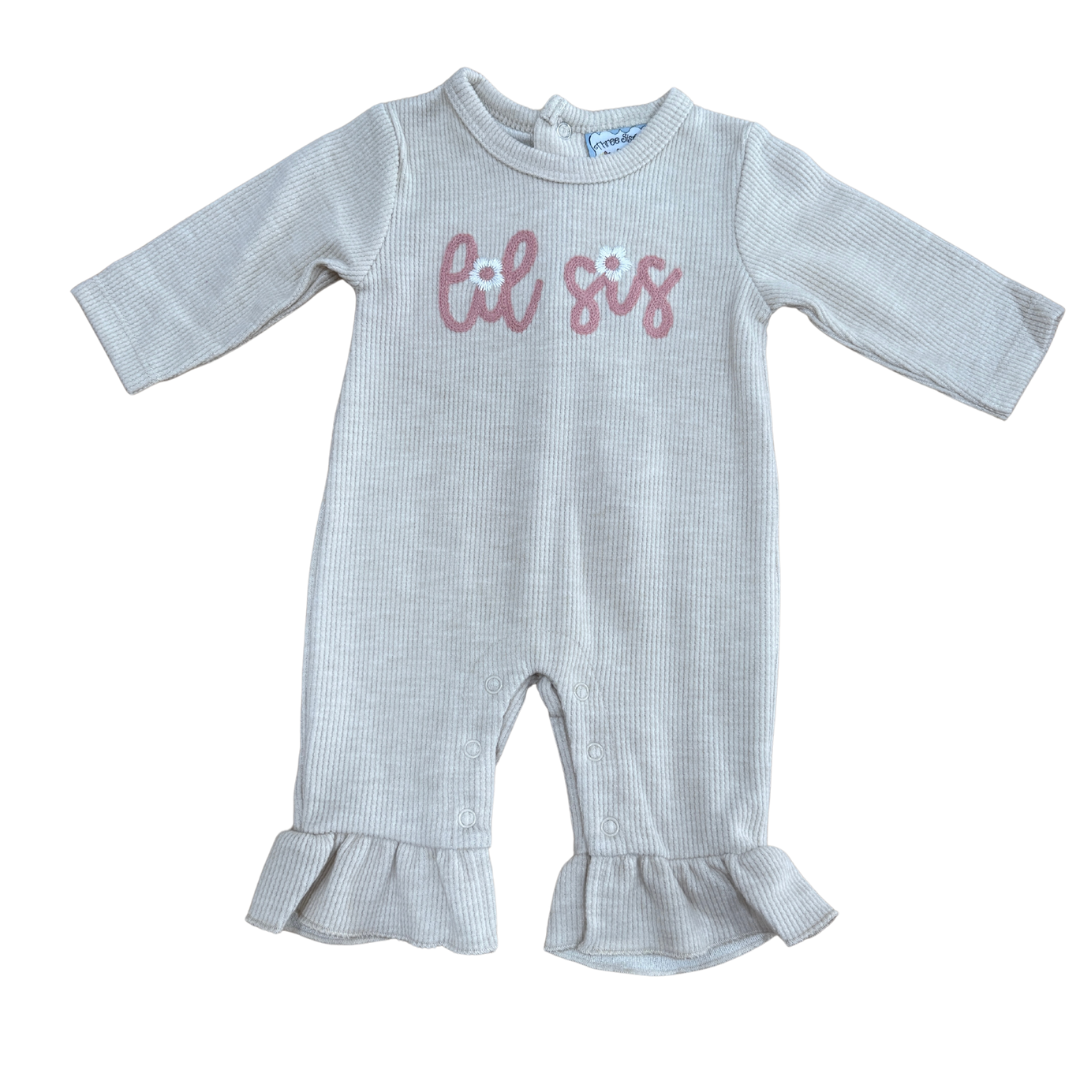 This adorable romper has lil sis embroidered in pink on the front with two flowers and ruffles at the ankles. It is a super soft chenille like fabric that you will love!