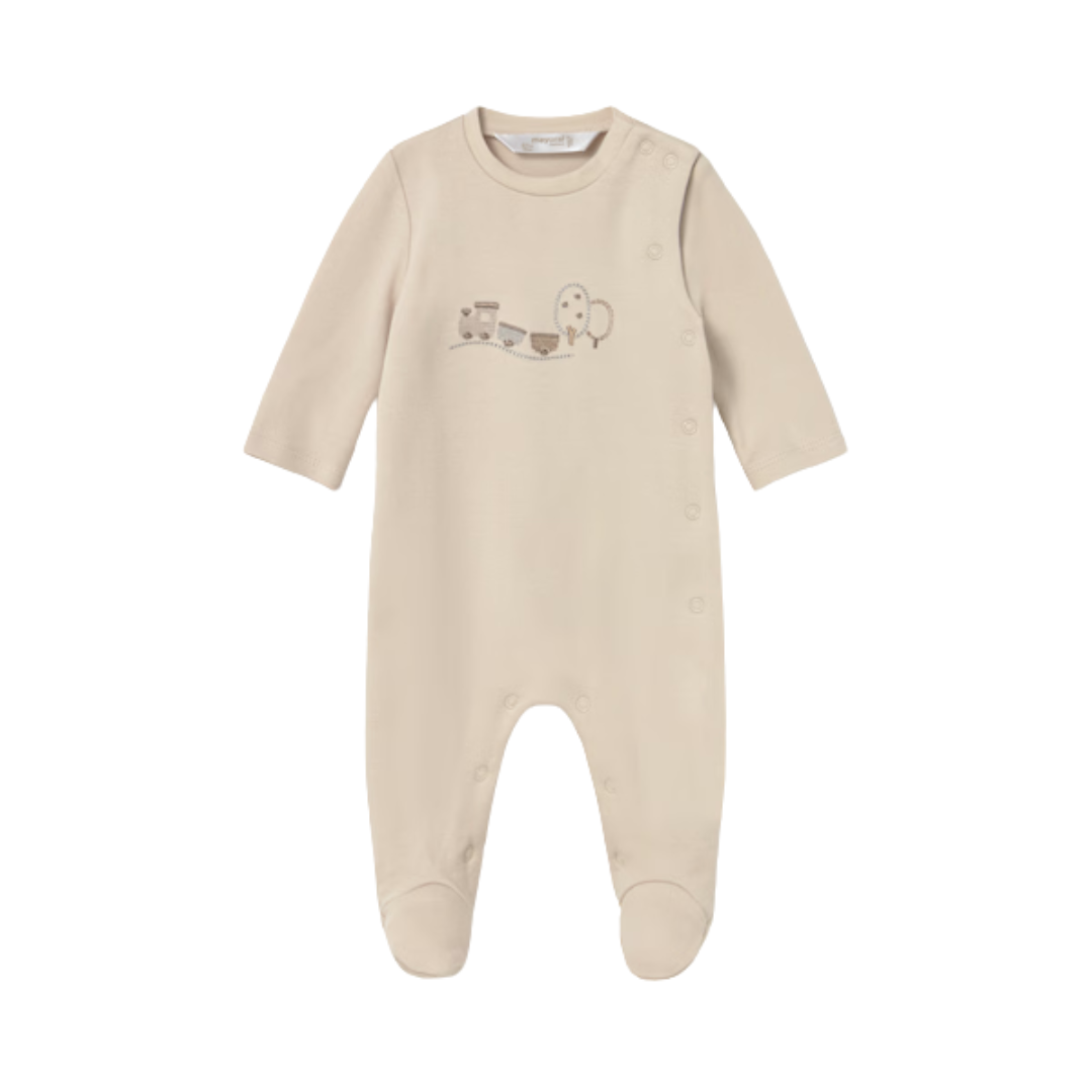 All aboard for cozy cuddles with this sweet train footie! This soft beige footie features a charming embroidered train and tree design across the chest, making it a sweet and nostalgic piece for your baby’s wardrobe. With snap buttons for easy changes and built-in feet for extra warmth, it’s the perfect blend of comfort and cuteness.
