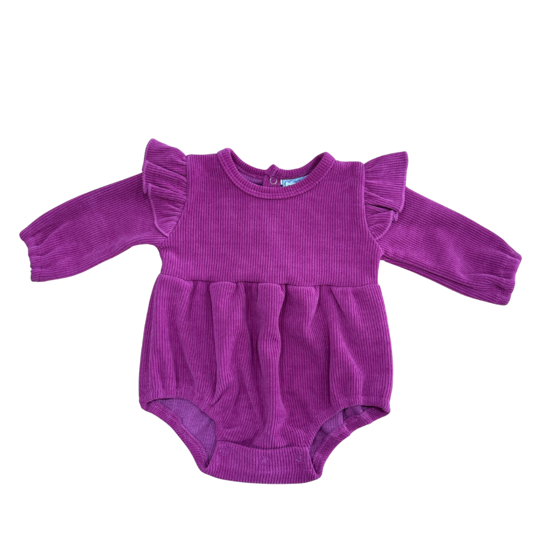 This Magenta long sleeved Raelyn bubble features ruffled shoulders in a fushia soft ribbed material. Pair with our Jefferies or Carlomango knee socks to make this an adorable fall/winter outfit they is sure to brighten your sweet girls smile!