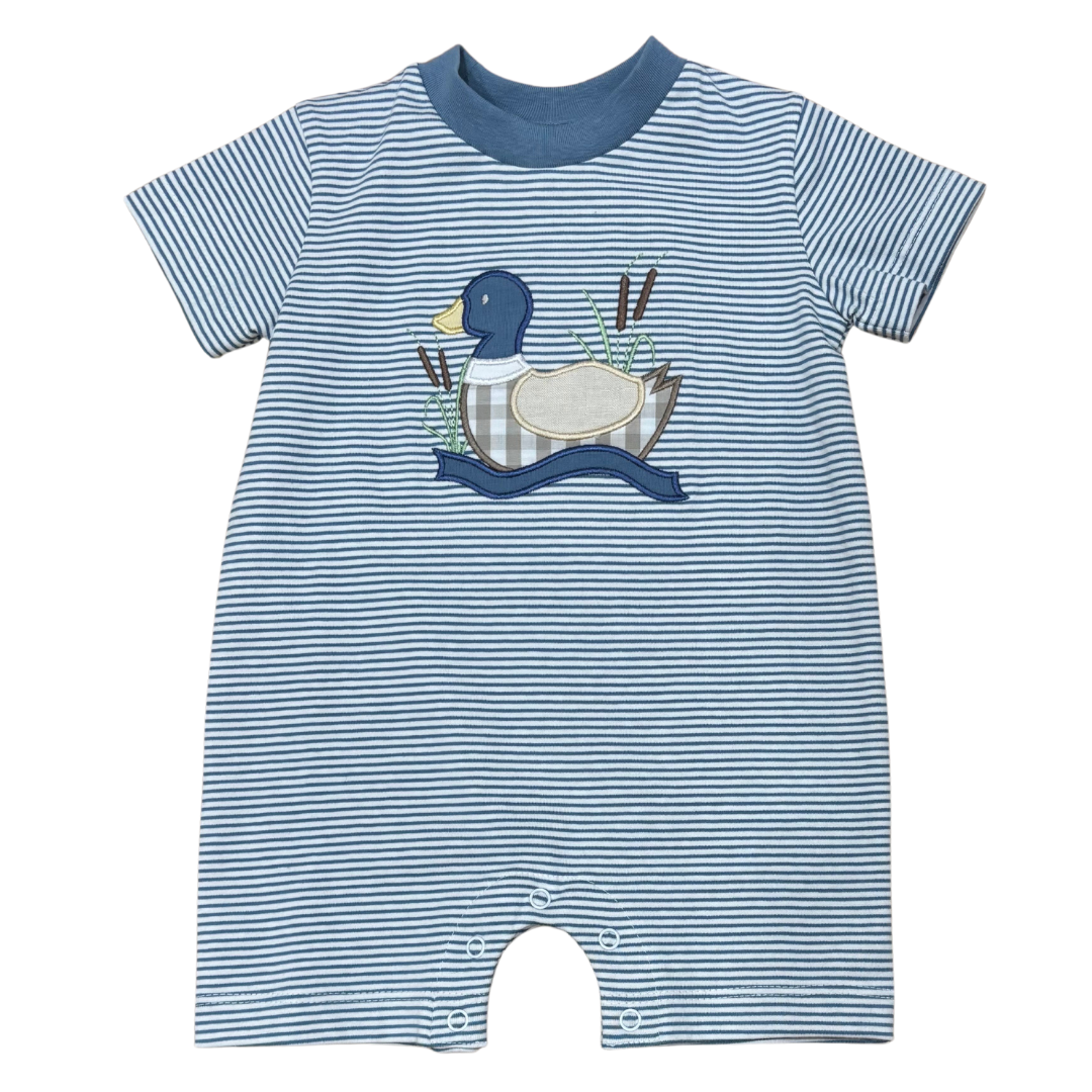This adorable romper features a blue and white stripes with an applique mallard duck on the front and snaps at the bottom for easy changing. Coordinate with the matching sibling sets!